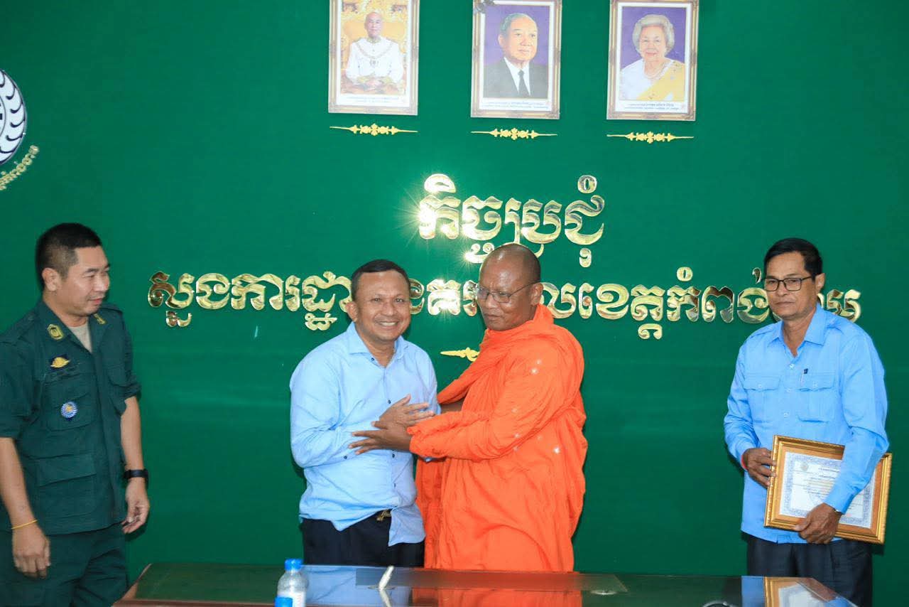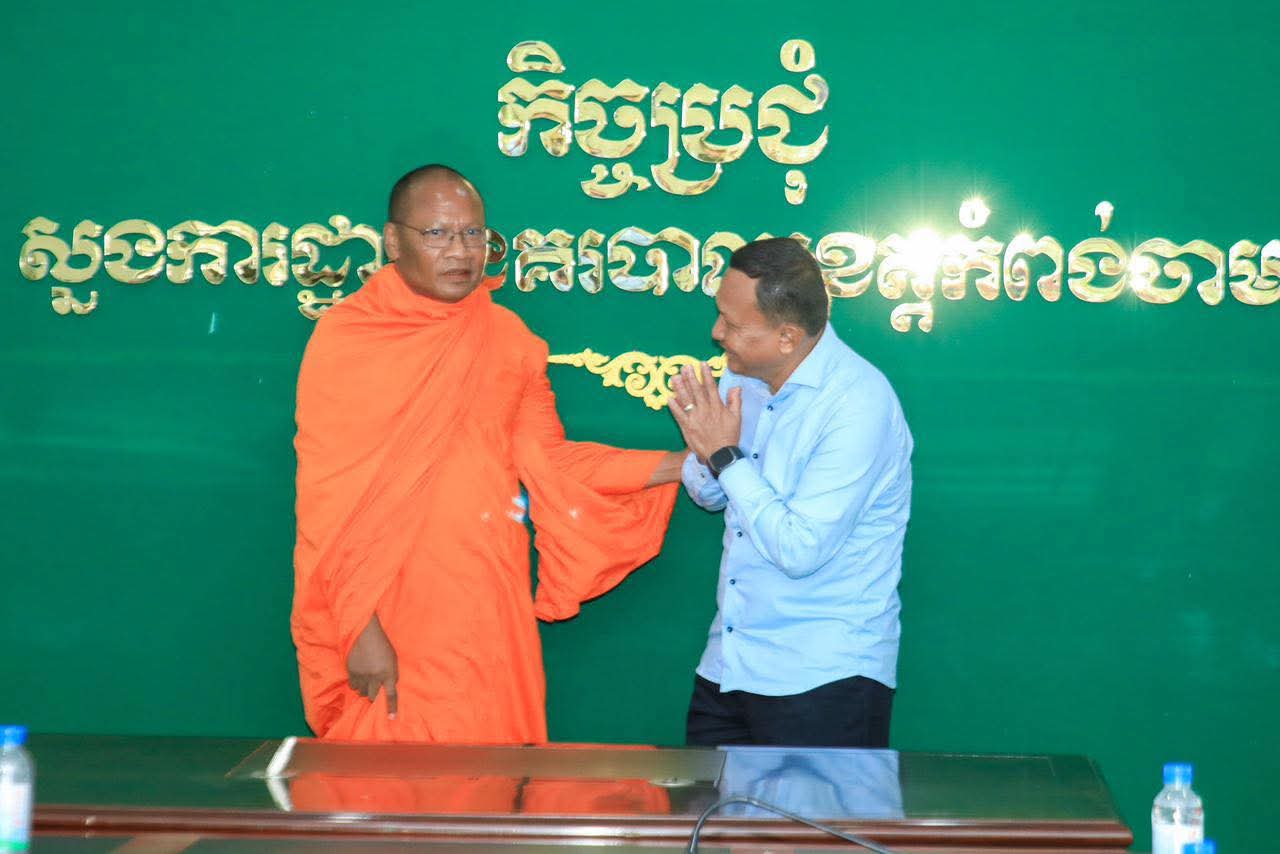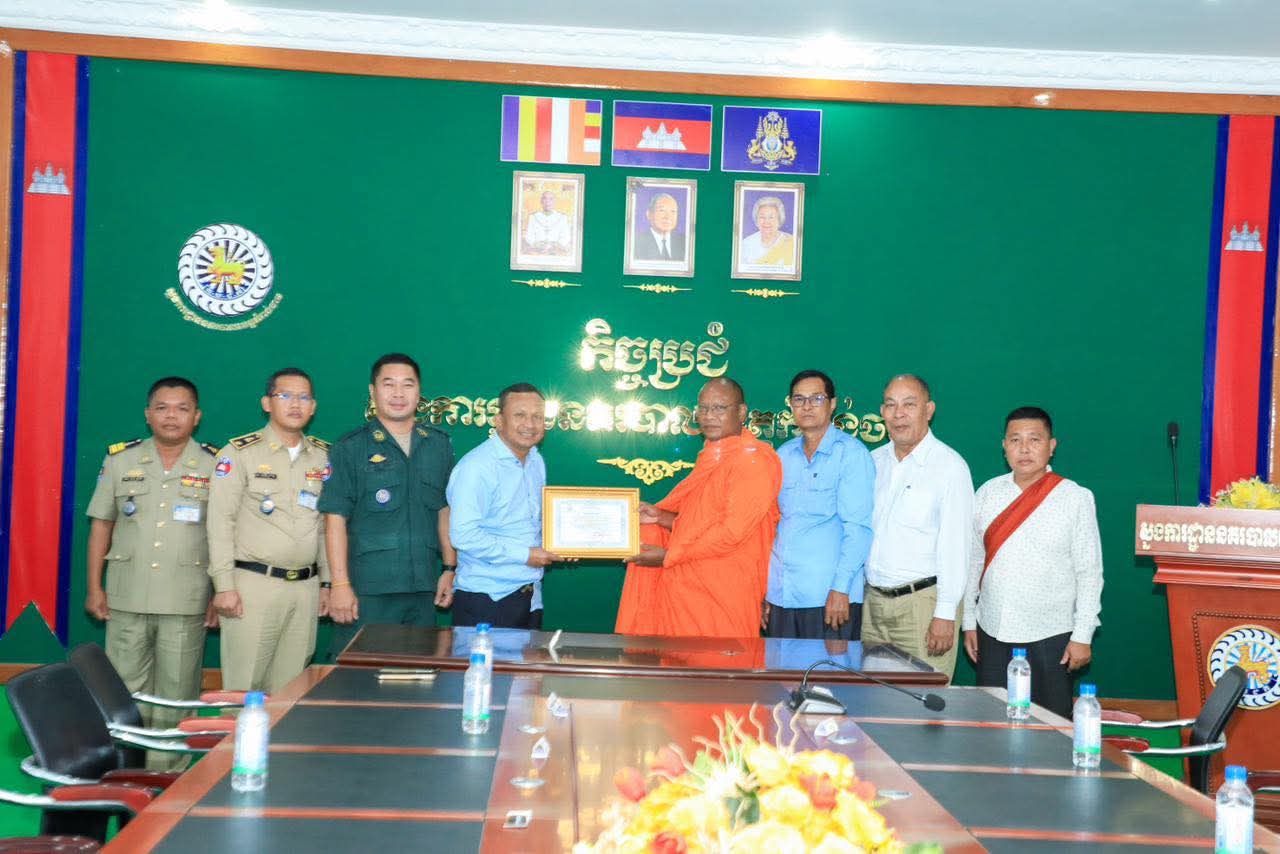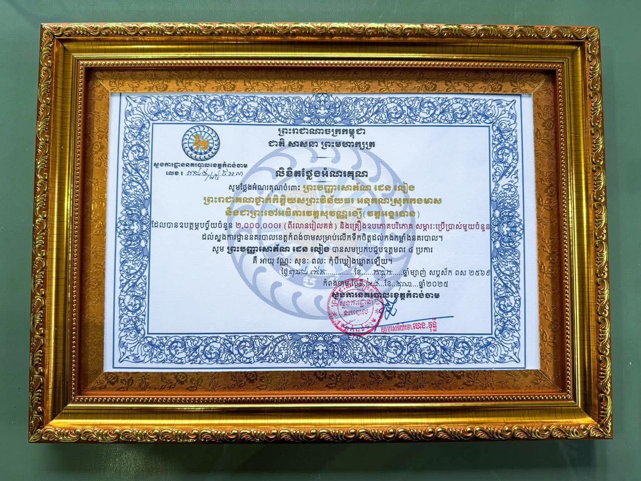 (កំពង់ចាម) :នាព្រឹកថ្ងៃព្រហស្បតិ៍ ទី៣០ ខែតុលា ឆ្នាំ២០២៥នេះ លោកឧត្តមសេនីយ៍ទោ ហេង វុទ្ធី ស្នងការនគរបាលខេត្តកំពង់ចាម និងសហការី បានទទួលទេយ្យទានពី ព្រះបញ្ញាសោភ័ណ ដេន លៀង ព្រះរាជាគណៈថ្នាក់កិត្តិយសព្រះវិន័យធរ អនុគណស្រុកកងមាស និងជាព្រះចៅអធិការវត្តសុវណ្ណរង្សី ហៅវត្តអង្គរបាន ដែលមានសទ្ធាដ៏ជ្រះថ្លាបំផុតបានជួយឧបត្ថម្ភគាំទ្រដល់សកម្មភាព និងជាការលើកទឹកចិត្តដល់កងកម្លាំង នៃស្នងការដ្ឋាននគរបាលខេត្តកំពង់ចាម ក្នុងប្រតិបត្តិការយ៉ាងសកម្មជូនប្រជាពលរដ្ឋក្នុងមូលដ្ឋាន នាពេលកន្លងមកនេះ តាមរយៈការឧបត្ថម្ភដូចជា: