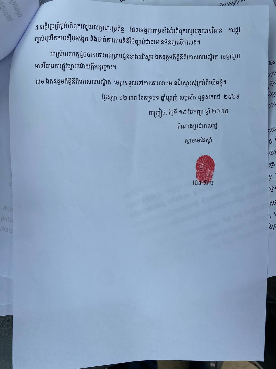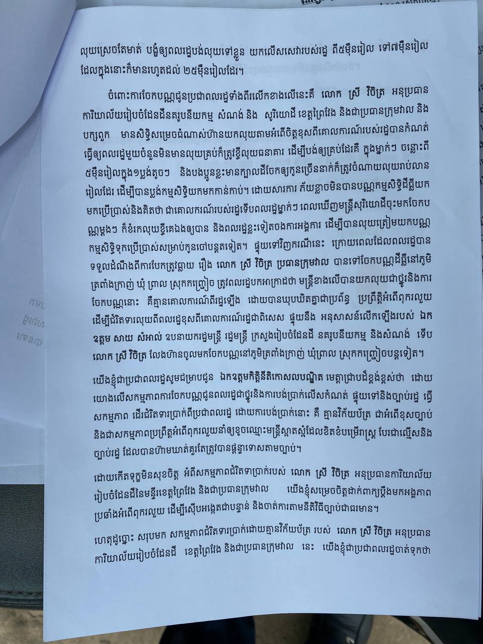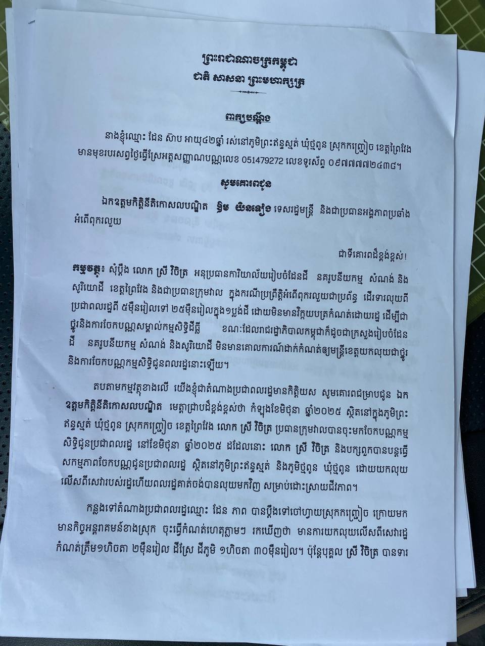 ផ្ទុយទៅវិញ កំឡុងខែមិថុនា ឆ្នាំ២០២៥ ស្ថិតនៅក្នុងភូមិព្រះ ឥន្ធស្មត់ ឃុំថ្មពូន ស្រុកកញ្ជ្រៀច ខេត្តព្រៃវែង លោក ស្រី វិចិត្រ ប្រធានក្រុមវាល បានចុះមកចែកបណ្ណកម្ម សិទ្ធិជូនប្រជាពលរដ្ឋ នៅខែមិថុនា ឆ្នាំ២០២៥ ដដែលនោះ លោក ស្រី វិចិត្រ និងបក្សពួកបានបន្តធ្វើសកម្មភាពចែកបណ្ណជូនប្រជាពលរដ្ឋ ស្ថិតនៅភូមិព្រះឥន្ធស្មត់ និងភូមិថ្មពូន ឃុំថ្មពូន ដោយយកលុយ លើសពីសេវារបស់រដ្ឋ ដែលបានកំណត់ហើយពលរដ្ឋគាត់ចង់បានលុយត្រឡប់មកវិញ សម្រាប់ដោះស្រាយជីវភាព។