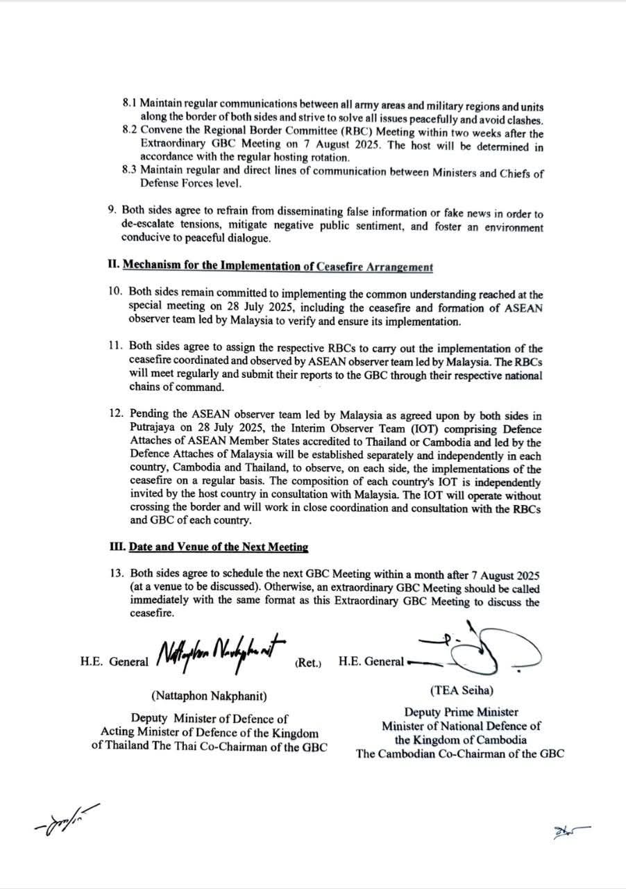 ភាគីទាំងពីរកម្ពុជា-ថៃបានពិភាក្សានិងឯកភាពគ្នាលើលក្ខខណ្ឌនៃការអនុវត្តបទឈប់បាញ់និងការបង្កើនការប្រាស្រ័យទាក់ទងគ្នារវាងកងទ័ពទាំងពីរ។ ភាគីទាំងពីរក៏បានយល់ព្រមជំរុញការរៀបចំលក្ខខណ្ឌប្រតិបត្តិនៃយន្តការតាមដានត្រួតពិនិត្យការអនុវត្តបទឈប់បាញ់របស់ក្រុមអ្នកសង្កេតការណ៍អាស៊ាន (ASEAN Observer Team) និងឯកភាពឱ្យមានក្រុមអ្នកសង្កេតការណ៍បណ្តោះអាសន្ន (Interim Observer Team) ដឹកនាំដោយអនុព័ន្ធយោធាម៉ាឡេស៊ីដើម្បីសង្កេតការណ៍ភ្លាមៗនិងបន្តរៀបចំក្រុមអ្នកសង្កេតការណ៍អាស៊ាន (ASEAN Observer Team)។