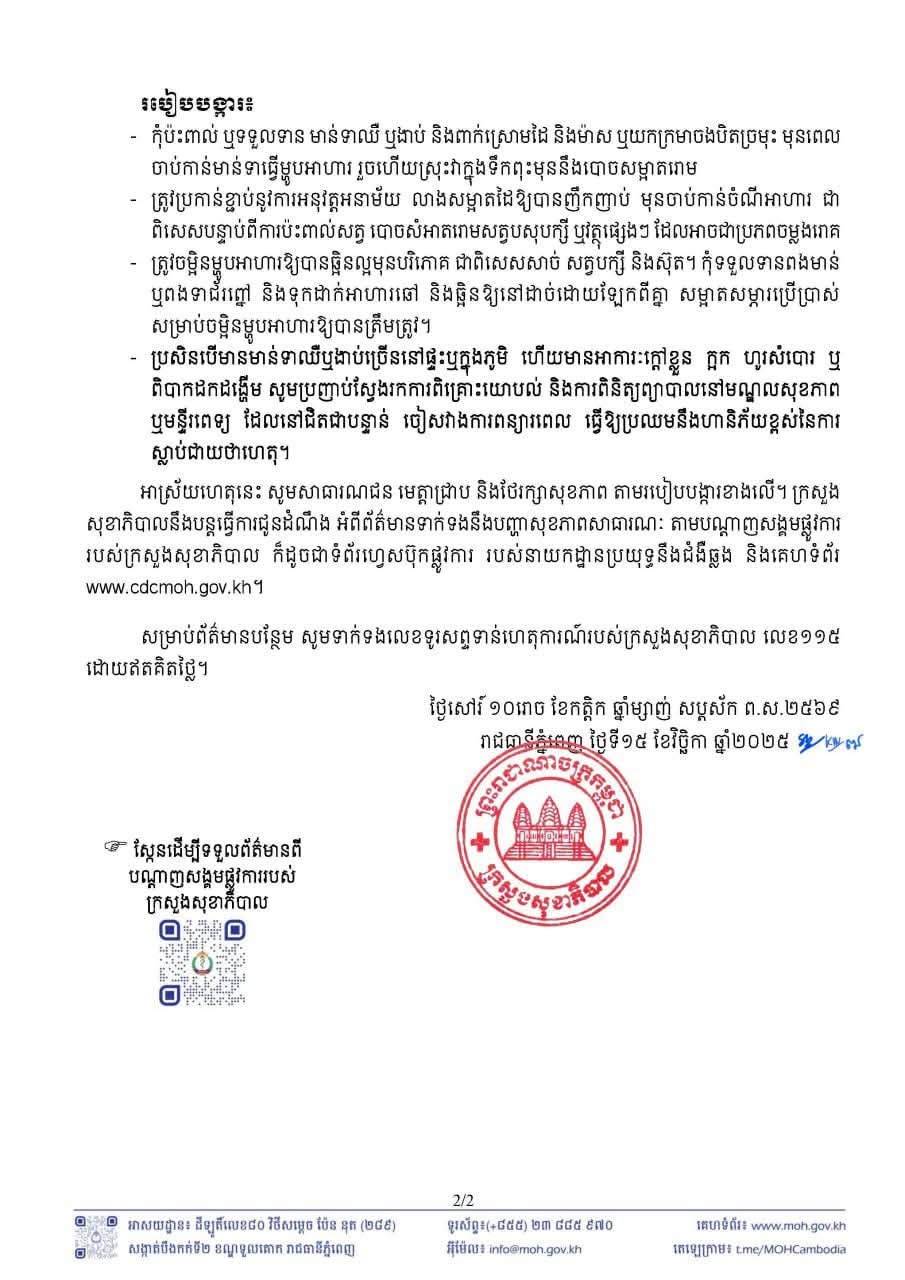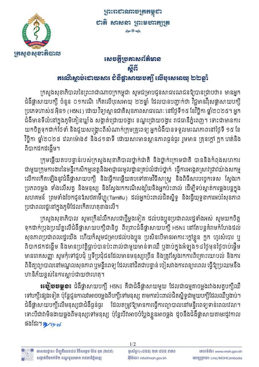 (ភ្នំពេញ)៖ ក្រសួងសុខាភិបាល នៅព្រឹកថ្ងៃទី១៦ ខែវិច្ឆិកា ឆ្នាំ២០២៥នេះ បានចេញសេចក្តីប្រកាសព័ត៌មាន ស្តីពីករណីស្លាប់ដោយសារជំងឺផ្តាសាយបក្សី លើបុរសអាយុ ២២ឆ្នាំម្នាក់ រស់នៅខណ្ឌជ្រោយចង្វារ រាជធានីភ្នំពេញ។ (FN)