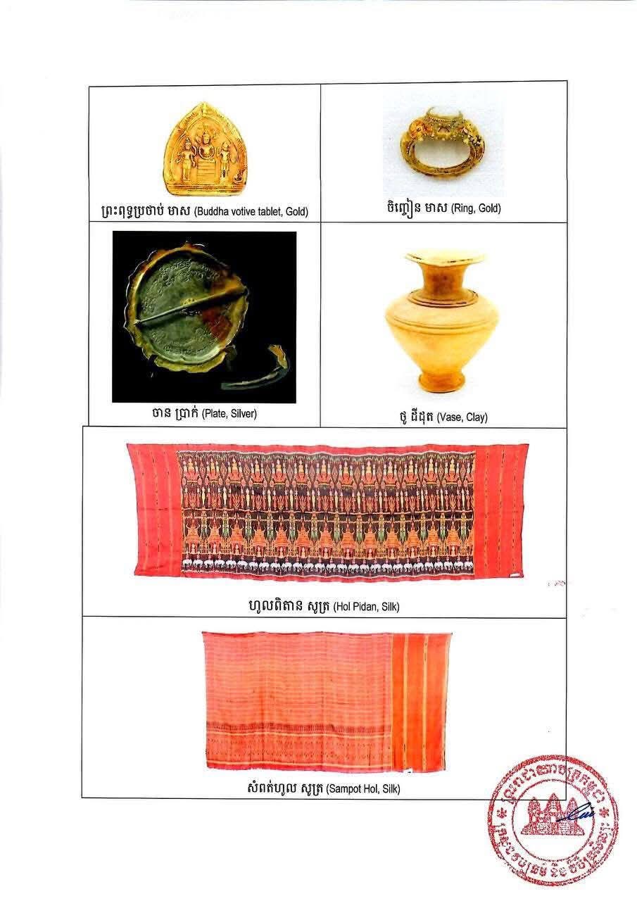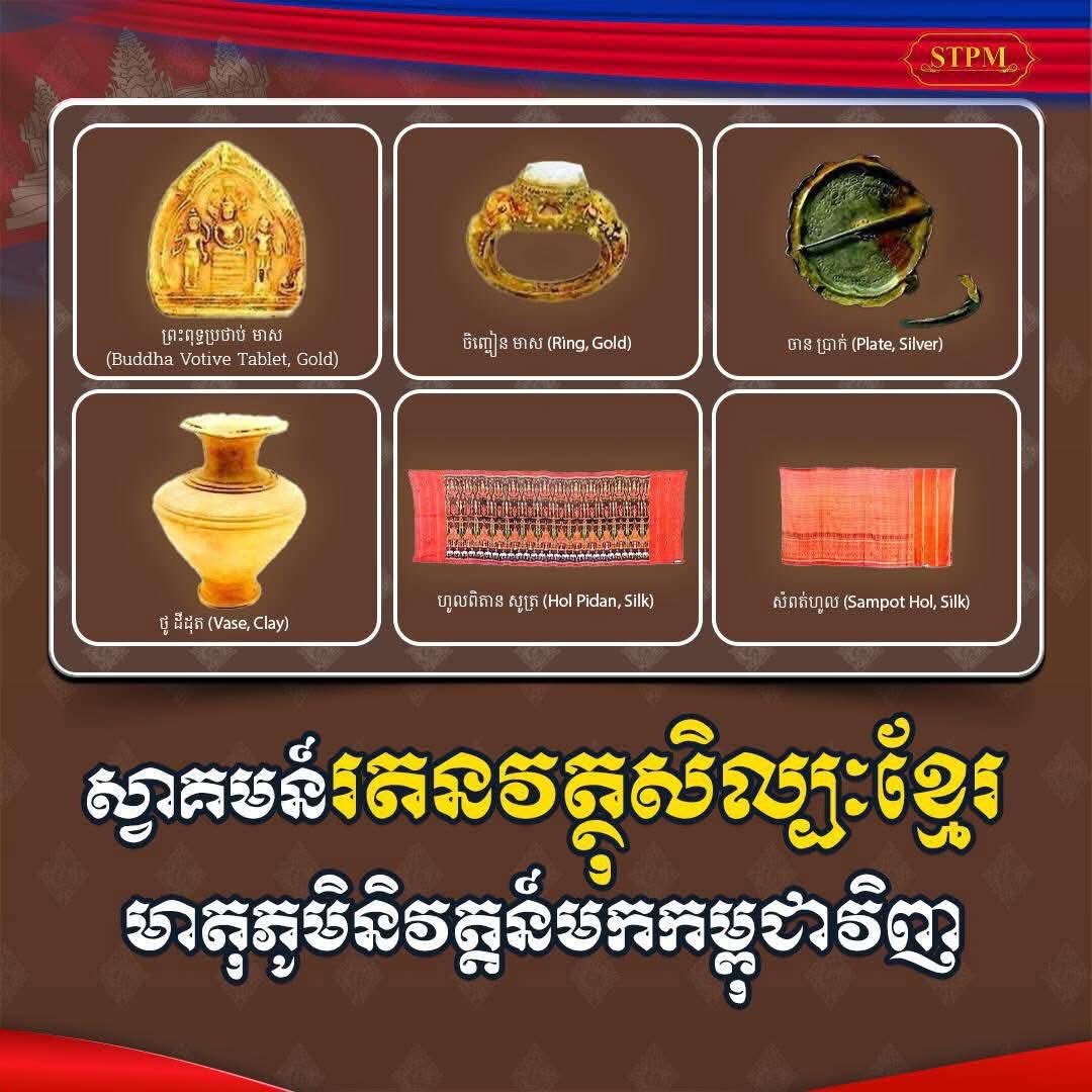 រតនវត្ថុសិល្បៈខ្មែរ រួមមាន៖ វាយនភណ្ឌសូត្រខ្មែរ ចំនួន ១៨៣ផ្ទាំង និងវត្ថុសម័យបុរេប្រវត្តិសាស្ត្រ ដូចជា៖ កាក់ អង្កាំ គ្រឿងអលង្ការ និងវត្ថុប្រើប្រាស់ធ្វើពីលោហធាតុមានតម្លៃ សំរិទ្ធ ថ្ម និងដីដុត ព្រមទាំងសមុច្ច័យសំខាន់ៗ ដូចជា៖ វត្ថុធ្វើអំពីថ្ម និងសំរិទ្ធ ក្នុងសម័យមុនអង្គរ និងសម័យអង្គរ គឺសុទ្ធសឹងជាកេរតំណែលពីបុព្វបុរសខ្មែរសម្រាប់កូនចៅជំនាន់ក្រោយ ដោយប្រៀបបាននឹងការវិលត្រឡប់នូវព្រលឹងដូនតាខ្មែរ៕