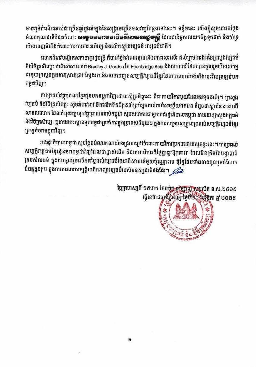 (ភ្នំពេញ)៖ សម្តេចបវរធិបតី ហ៊ុន ម៉ាណែត នាយករដ្ឋមន្ត្រីនៃកម្ពុជា នៅព្រឹកថ្ងៃទី២១ ខែវិច្ឆិកា ឆ្នាំ២០២៥នេះ បានបង្ហោះសារអបអរសាទរ និងស្វាគមន៍រតនវត្ថុសិល្បៈខ្មែរ មាតុភូមិនិវត្តន៍មកកម្ពុជាវិញ។