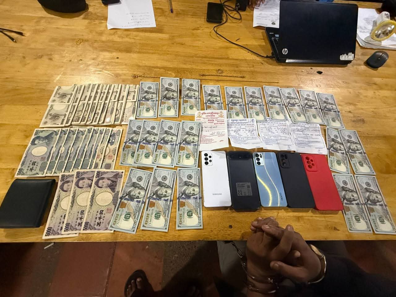 សម្ភារៈដកហូតរួមមាន៖ ម៉ូតូចំនួន១គ្រឿងម៉ាក ADV ពណ៌ស ពាក់ស្លាកលេខភ្នំពេញ 1MB5101, ទូរស័ព្ទចំនួន៣គ្រឿង, លោហៈធាតុខ្សែក ប្រវែង៥៥សង់ទីម៉ែត្រ ចំនួន១ខ្សែមានបន្តោងរូបយុទ្ធនាការ, លោហៈធាតុប្រភេទខ្សែដៃ ប្រវែង ១៨សង់ទីម៉ែត្រ, លោហ:ធាតុប្រភេទចិញ្ចៀន១វង់, ប្រាក់ចំនួន២១០០ដុល្លារអាមេរិក និងប្រាក់ចំនួន១,០២៤,០០០យេន។ បច្ចុប្បន្នជនសង្ស័យខាងលើ កំពុងកសាងសំណុំរឿងចាត់ការតាមនីតិវិធី៕