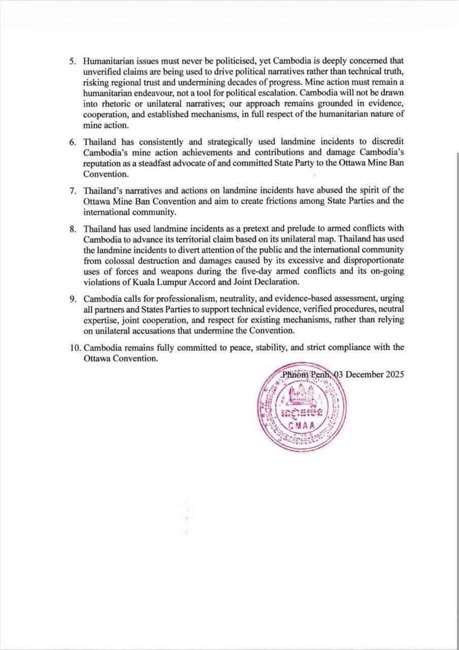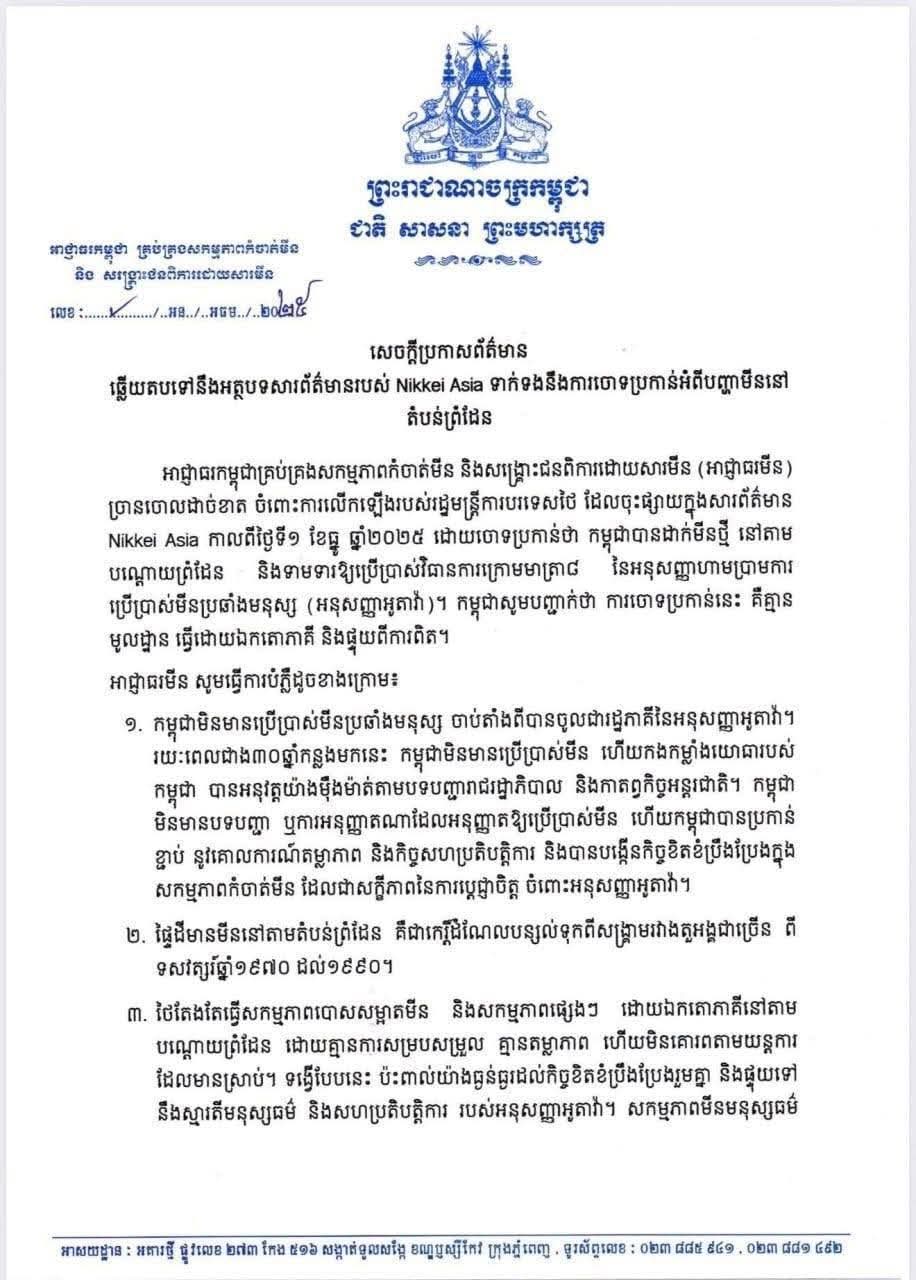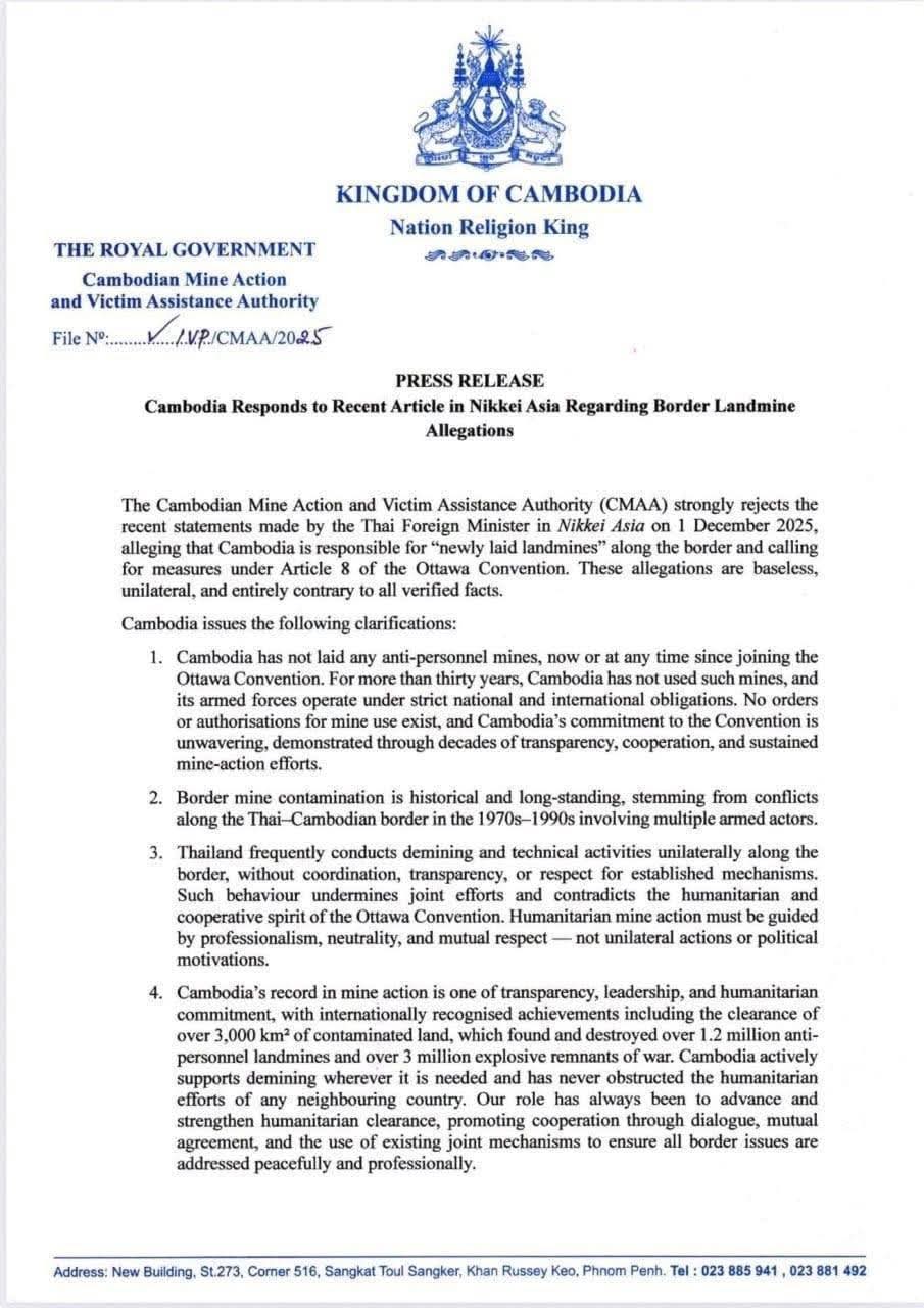 (ភ្នំពេញ) :យោងតាមសេចក្តីប្រកាសព័ត៌មានរបស់អាជ្ញាធរកម្ពុជា គ្រប់គ្រងសកម្មភាពកំចាត់មីន និង សង្គ្រោះជនពិការដោយសារមីនដែលឆ្លើយតបទៅនឹងអត្ថបទសារព័ត៌មានរបស់ Nikkei Asia ទាក់ទងនឹងការចោទប្រកាន់អំពីបញ្ហាមីននៅតំបន់ព្រំដែននៅថ្ងៃទី៣ ខែធ្នូ ឆ្នាំ២០២៥ បានឱ្យដឹងថា អាជ្ញាធរកម្ពុជាគ្រប់គ្រងសកម្មភាពកំចាត់មីន និងសង្គ្រោះជនពិការដោយសារមីន (អាជ្ញាធរមីន) ច្រានចោលដាច់ខាត ចំពោះការលើកឡើងរបស់រដ្ឋមន្ត្រីការបរទេសថៃ ដែលចុះផ្សាយក្នុងសារព័ត៌មាន Nikkei Asia កាលពីថ្ងៃទី១ ខែធ្នូ ឆ្នាំ២០២៥ ដោយចោទប្រកាន់ថា កម្ពុជាបានដាក់មីនថ្មី នៅតាមបណ្តោយព្រំដែន និងទាមទារឱ្យប្រើប្រាស់វិធានការក្រោមមាត្រា៨ នៃអនុសញ្ញាហាមប្រាមការប្រើប្រាស់មីនប្រឆាំងមនុស្ស (អនុសញ្ញាអូតាវ៉ា)។ កម្ពុជាសូមបញ្ជាក់ថា ការចោទប្រកាន់នេះ គឺគ្មាន មូលដ្ឋាន ធ្វើដោយឯកតោភាគី និងផ្ទុយពីការពិត។