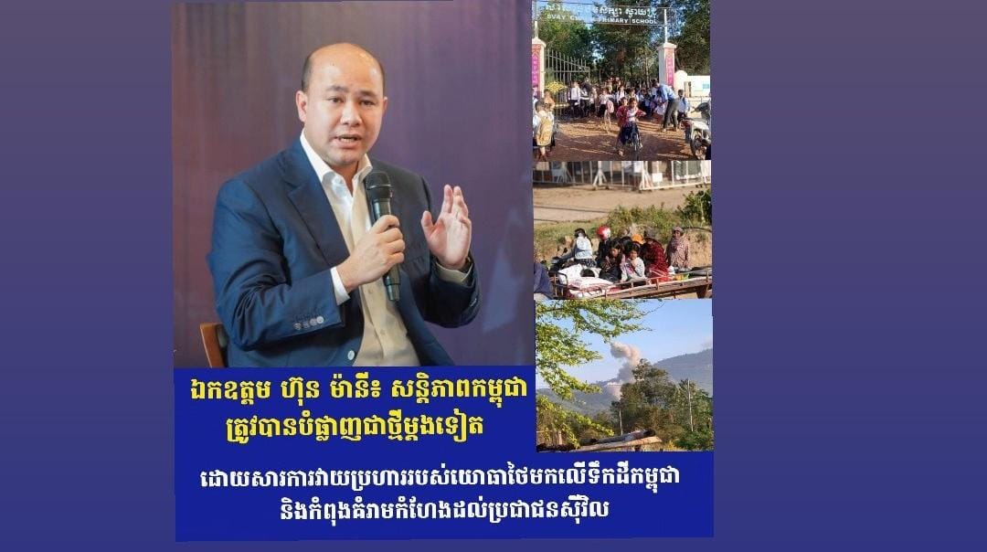 (ភ្នំពេញ) :យោងតាមការបង្ហោះផ្សាយនៅក្នុងបណ្តាញសង្គមរបស់ឯកឧត្តម ឧបនាយករដ្ឋមន្រ្តី ហ៊ុន ម៉ានី រដ្ឋមន្រ្តីក្រសួង មុខងារសាធារណៈ បានឱ្យដឹងថា នៅព្រឹកថ្ងៃទី៨ ខែធ្នូ ឆ្នាំ២០២៥ សន្តិភាពកម្ពុជាត្រូវបានបំផ្លាញជាថ្មីម្តងទៀត ជាពិសេសចាប់តាំងពីព្រឹត្តិការណ៍នៃ «សេចក្តីថ្លែងការណ៍រួម» ដែលបានចុះហត្ថលេខានៅថ្ងៃទី២៦ ខែតុលា នៅទីក្រុងគូឡាឡាំពួ ក្រោមវត្តមានរបស់ប្រធានាធិបតី Trump, នាយករដ្ឋមន្ត្រី Anwar Ibrahim រួមជាមួយនឹងសម្តេចនាយករដ្ឋមន្រ្តី ហ៊ុន ម៉ាណែត និងនាយករដ្ឋមន្រ្តី Anutin Charnvirakul។
