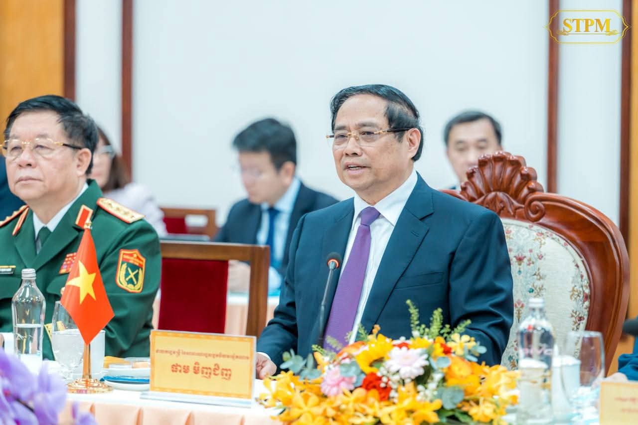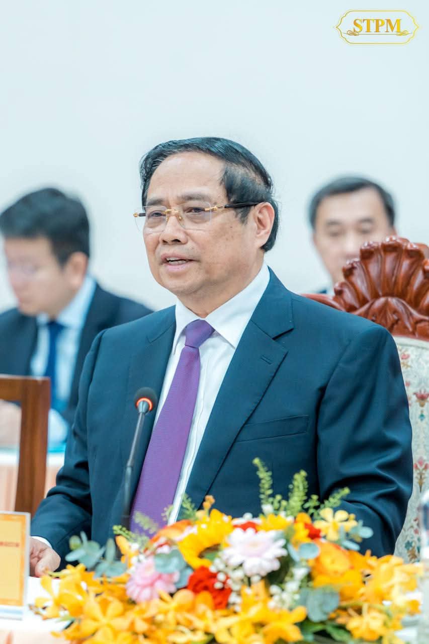 នៅក្នុងជំនួបនេះ, ឯកឧត្តមនាយករដ្ឋមន្រ្តីវៀតណាម បានសម្ដែងនូវក្តីសោមនស្សរីករាយ និងការស្វាគមន៍យ៉ាងកក់ក្ដៅចំពោះវត្តមានដ៏ខ្ពង់ខ្ពស់របស់ សម្ដេចបវរធិបតី និងគណៈប្រតិភូកម្ពុជា។ ឯកឧត្តមបានអបអរសាទរ និងវាយតម្លៃខ្ពស់ចំពោះការសម្ពោធដាក់ឱ្យដំណើរការជាផ្លូវការច្រកទ្វារព្រំដែន ម៉ឺនជ័យ-តឹនណាម ដែលជាសមិទ្ធផលថ្មីឆ្លុះបញ្ចាំងពីភាពរីកចម្រើននៃទំនាក់ទំនង និងកិច្ចសហប្រតិបត្តិការទ្វេភាគី។ ទន្ទឹមនេះ, ឯកឧត្តមបានអបអរសាទរចំពោះការសម្រេចបាននូវសមិទ្ធផលថ្មីៗរបស់កម្ពុជា ក្នុងការធានាបាននូវស្ថិរភាពនយោបាយ និងការអភិវឌ្ឍសង្គម-សេដ្ឋកិច្ច ដែលបានរួមចំណែកលើកកម្ពស់ជីវភាពប្រជាពលរដ្ឋជាលំដាប់។ ឯកឧត្តមបានបង្ហាញនូវជំនឿជឿជាក់យ៉ាងមុតមាំថា ក្រោមការដឹកនាំដ៏ឈ្លាសវៃរបស់ សម្ដេចបវរធិបតី កម្ពុជានឹងបន្តការអភិវឌ្ឍរីកចម្រើនលើគ្រប់វិស័យបន្ថែមទៀត។ ឯកឧត្តមនាយករដ្ឋមន្ត្រីវៀតណាម បានបញ្ជាក់ជាថ្មីនូវការប្ដេជ្ញាចិត្តក្នុងការបន្តជំរុញទំនាក់ទំនង និងកិច្ចសហប្រតិបត្តិការទ្វេភាគី ឱ្យកាន់តែរឹងមាំ និងស៊ីជម្រៅ។