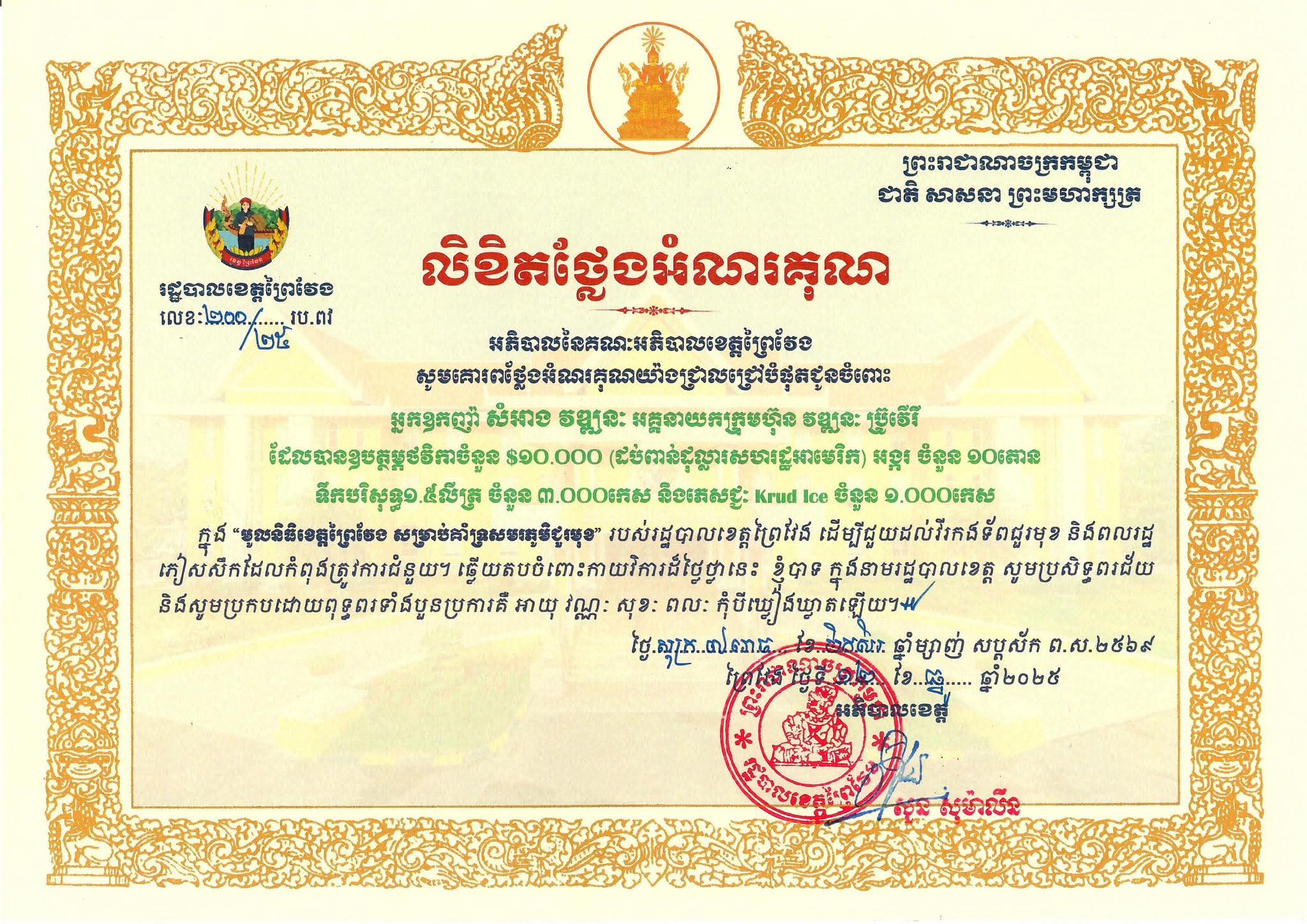 (ព្រៃវែង) : ឯកឧត្តម សួន សុម៉ាលីន អភិបាលនៃគណ: អភិបាលខេត្តព្រៃវែង ថ្ងៃទី១២ ខែធ្នូ ឆ្នាំ២០២៥ រដ្ឋបាលខេត្តព្រៃវែង សូមថ្លែងអំណរគុណយ៉ាងជ្រាលជ្រៅចំពោះ អ្នកឧកញ៉ា សំអាង វឌ្ឍនៈ អគ្គនាយកក្រុមហ៊ុន វឌ្ឍនៈ ប្រ៊ូវើរី ដែលបានឧបត្ថម្ភថវិកាចំនួន $១០,០០០ (ដប់ពាន់ដុល្លារអាមេរិកគត់ អង្ករ ចំនួន ១០តោន ទឹកបរិសុទ្ធ ១.៥លីត្រ ចំនួន ៣.០០០កេស និងភេសជ្ជៈ krud Ice ចំនួន ១.០០០កេស ក្នុង “មូលនិធិខេត្តព្រៃវែង សម្រាប់គាំទ្រសមរភូមិជួរមុខ” ដើម្បីជួយគាំទ្រលើកទឹកចិត្តដល់វីរកងទ័ពកម្ពុជា ដែលកំពុងឈរជើងការពារបូរណភាពទឹកដី និងអធិបតេយ្យជាតិ ពីការឈ្លានពានរបស់សត្រូវ រួមទាំងការចូលរួមដល់ជនភៀសសឹកដែលកំពុងជម្លៀសខ្លួនដែលត្រូវការជំនួយសម្រាប់ដោះស្រាយជីវភាពប្រចាំថ្ងៃ។