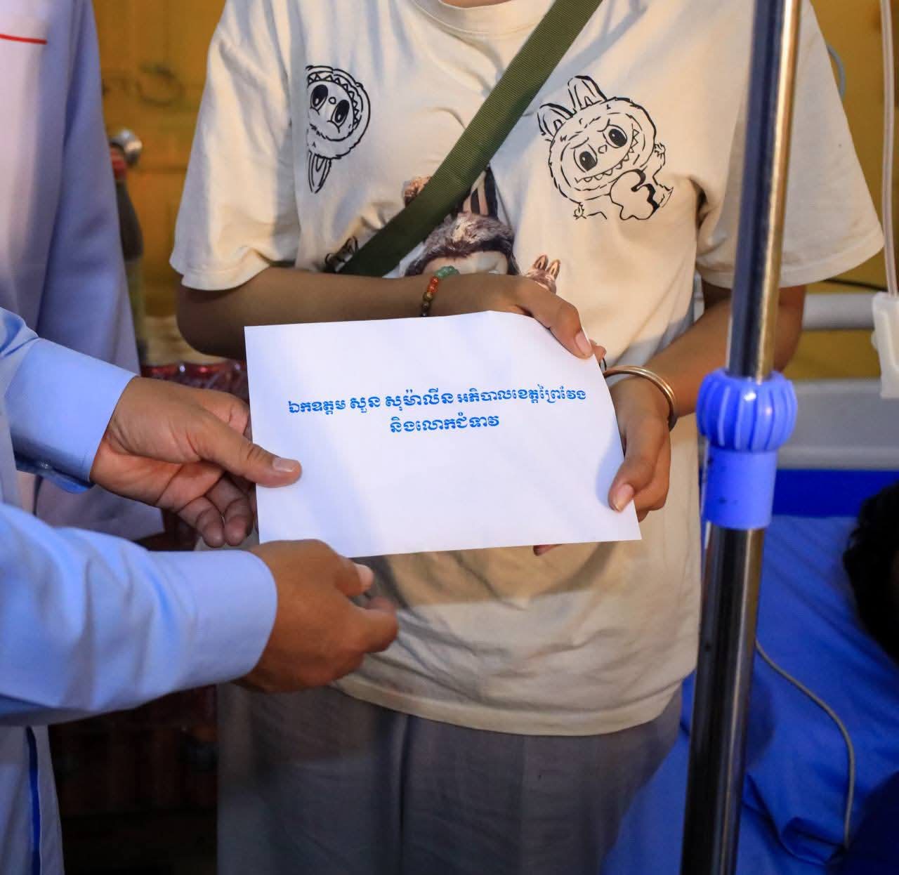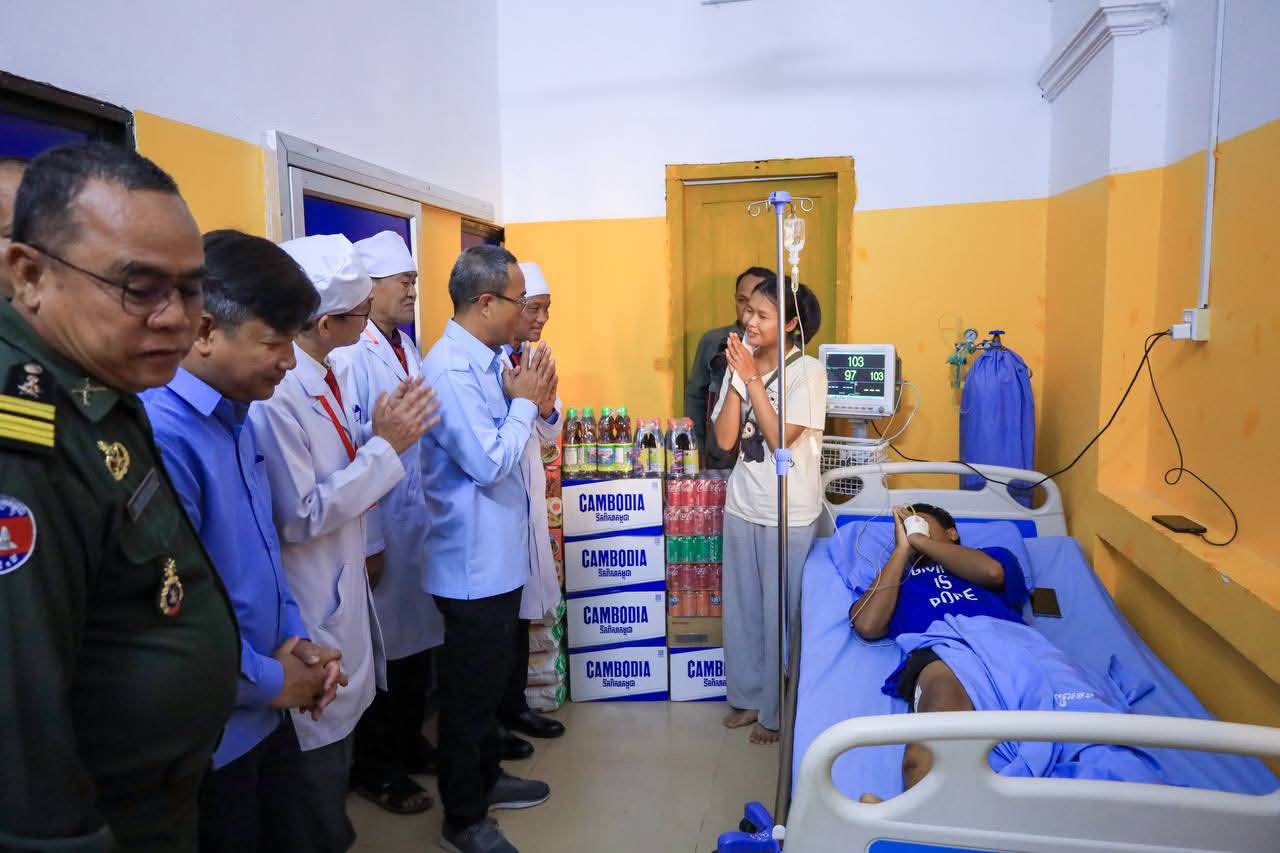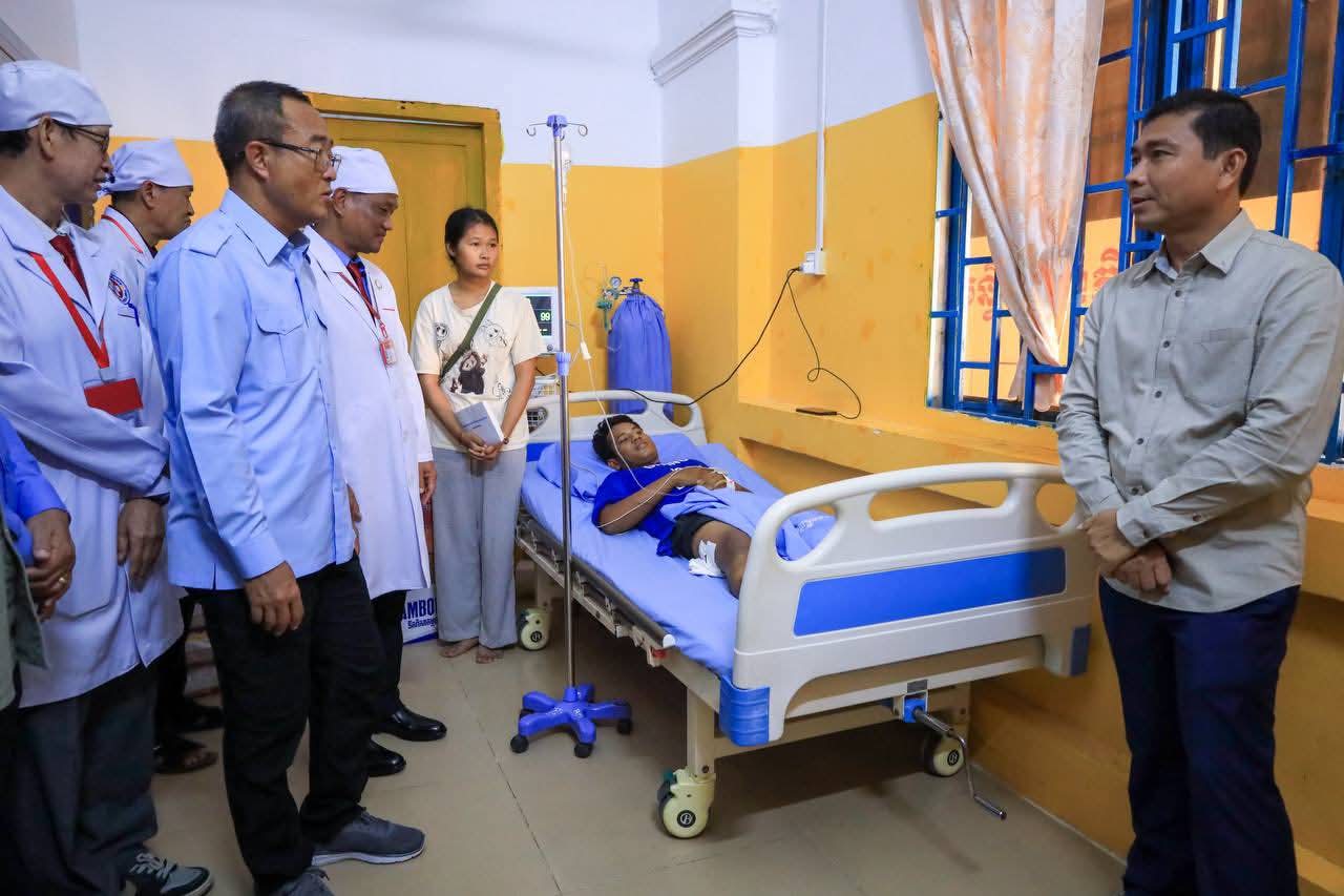 (ព្រៃវែង) : នៅព្រឹកថ្ងៃអាទិត្យ ទី១០ ខែសីហា ឆ្នាំ២០២៥នេះ ឯកឧត្តម សួន សុម៉ាលីន អភិបាល នៃគណៈអភិបាលខេត្តព្រៃវែង រួមជាមួយថ្នាក់ដឹកនាំខេត្ត បានអញ្ជើញចុះសួរសុខទុក្ខ លោក ណាង សុីណាត ដែលជាវីរៈកងទ័ពជួរមុខ ឈរជើងនៅខេត្តព្រះវិហារ ដែលរងរបួសអំឡុងពេលប្រយុទ្ធការពារបូរណភាពទឹកដី និងអធិបតេយ្យជាតិកម្ពុជា ពីការឈ្លានពានរបស់ខ្មាំងសត្រូវ បច្ចុប្បន្នបាននិងកំពុងសម្រាលព្យាបាល នៅមន្ទីរពេទ្យបង្អែក ខេត្តព្រៃវែ។