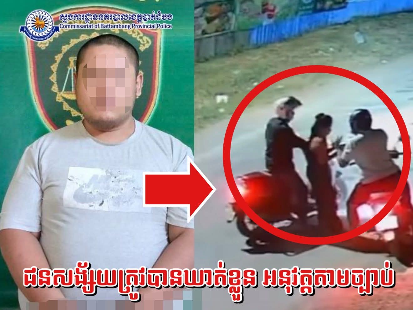 (បាត់ដំបង) :ថ្ងៃទី០៨ ខែសីហា ឆ្នាំ២០២៥ ដោយអនុវត្តតាមការដឹកនាំបញ្ជាដ៏ខ្ពង់ខ្ពស់ របស់ឯកឧត្តម នាយឧត្តមសេនី យ៍ ស ថេត អគ្គស្នងការនគរបាលជាតិ និងការបញ្ជាចង្អុលទិសរបស់លោកឧត្តមសេនីយ៍ទោ ដាញ់ អេងប៊ុន ចាន់ ស្នងការនៃស្នងការដ្ឋាននគរបាលខេត្តបាត់ ដំបង លោកវរសេនីយ៍ឯក ពេជ្រ សារ៉ែន អធិការនគរ បាល ក្រុងបាត់ដំបង សហការណ៍ជាមួយកម្លាំងអន្តរាគមន៍បង្ការបង្រ្កាបនៃស្នងការដ្ឋាន ធ្វើការស្រាវជ្រាវនិងបង្រ្កាប ឃាត់ខ្លួនជនសង័្សយចំនួន ០១នាក់ ក្នុងចំណោមបក្សពួកផ្សេងទៀត ដែលធ្វើសកម្មភាព(វ-ាយប្ល-ន់ យកម៉ូតូ)របស់ជនរងគ្រោះឈ្មោះ ស.គ ភេទ ស្រី អាយុ ២៨ ឆ្នាំ រស់នៅភូមិស្លាកែត សង្កាត់ស្លាកែត ក្រុងបាត់ដំបង កាលពីយប់ថ្ងៃទី ០៦ ខែ សីហា ឆ្នាំ ២០ ២៥ ចំណុចភូមិជ្រៃកោង សង្កាត់ស្លាកែត វេលាម៉ោង ២៣និង៣០នាទី ខណៈដែលជនរងគ្រោះជិះម៉ូតូម្នាក់ ឯងវិលត្រឡប់មកពីកន្លែងធ្វើការរបស់ខ្លួន និងយកបានម៉ូតូហុងដាស្កុបពីScoopy មួយគ្រឿងនិងទូរស័ព្ទដៃ ០១គ្រឿងផងដែរនិងបង្កឱ្យជងរងគ្រោះរងរបួសស្នាម។