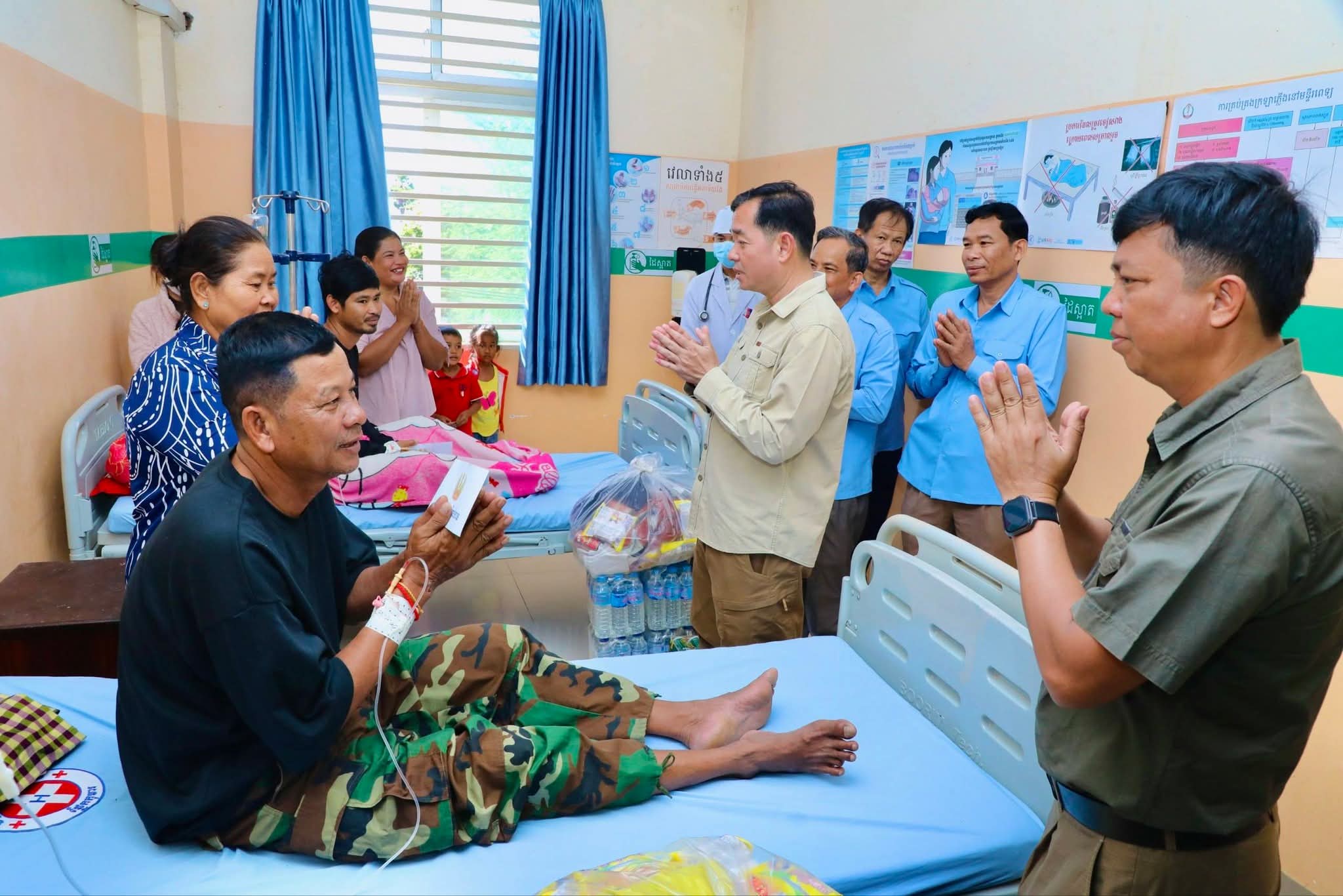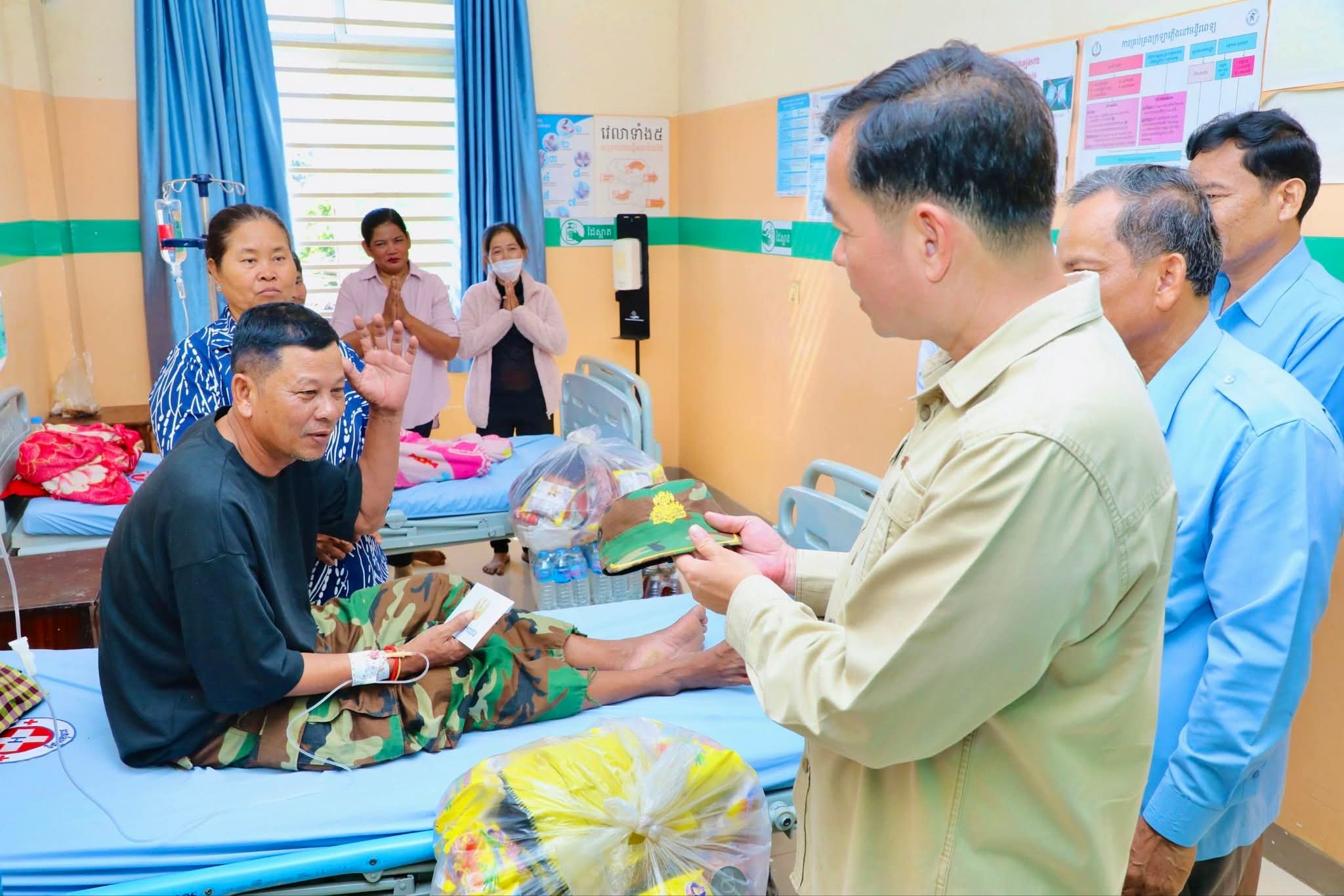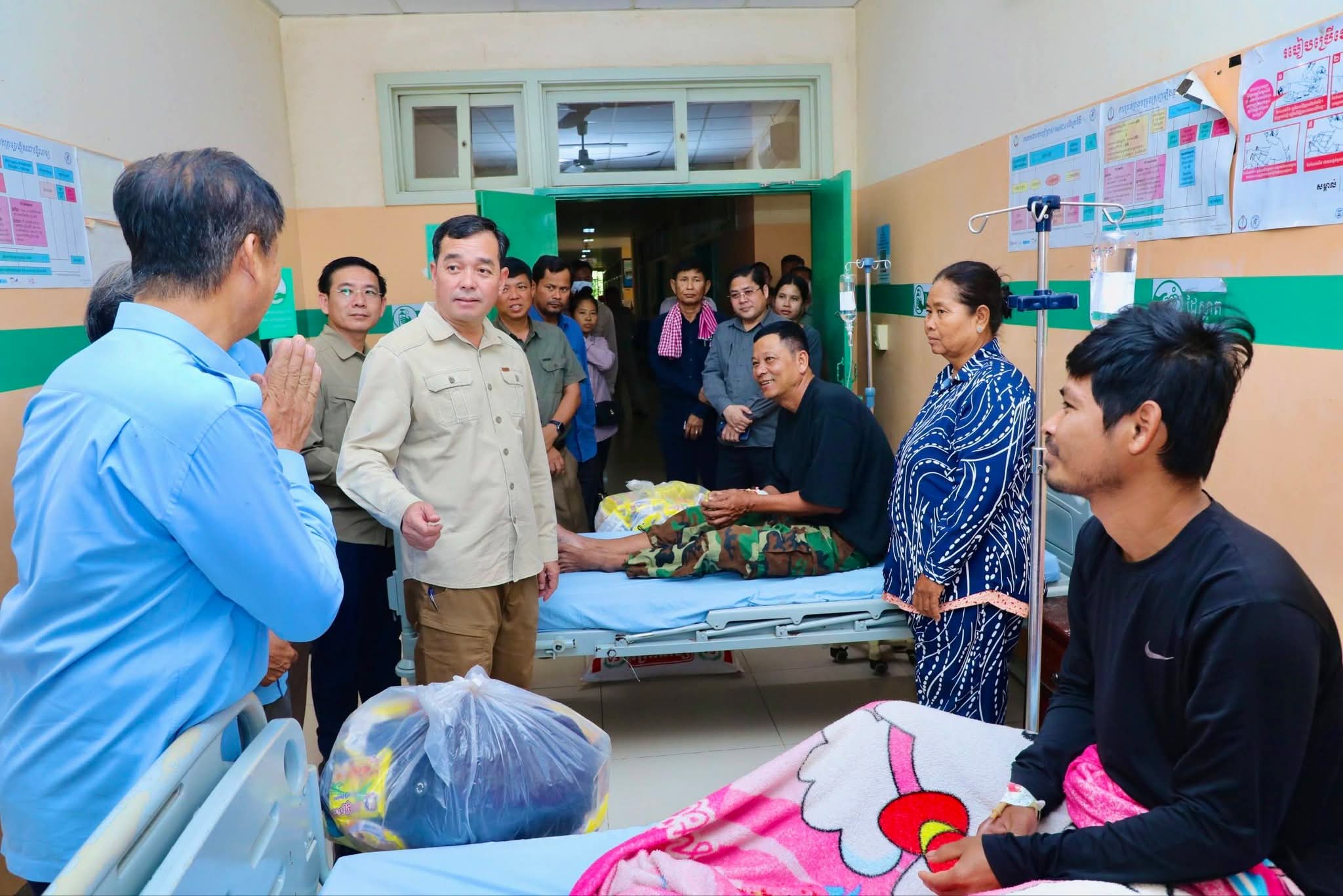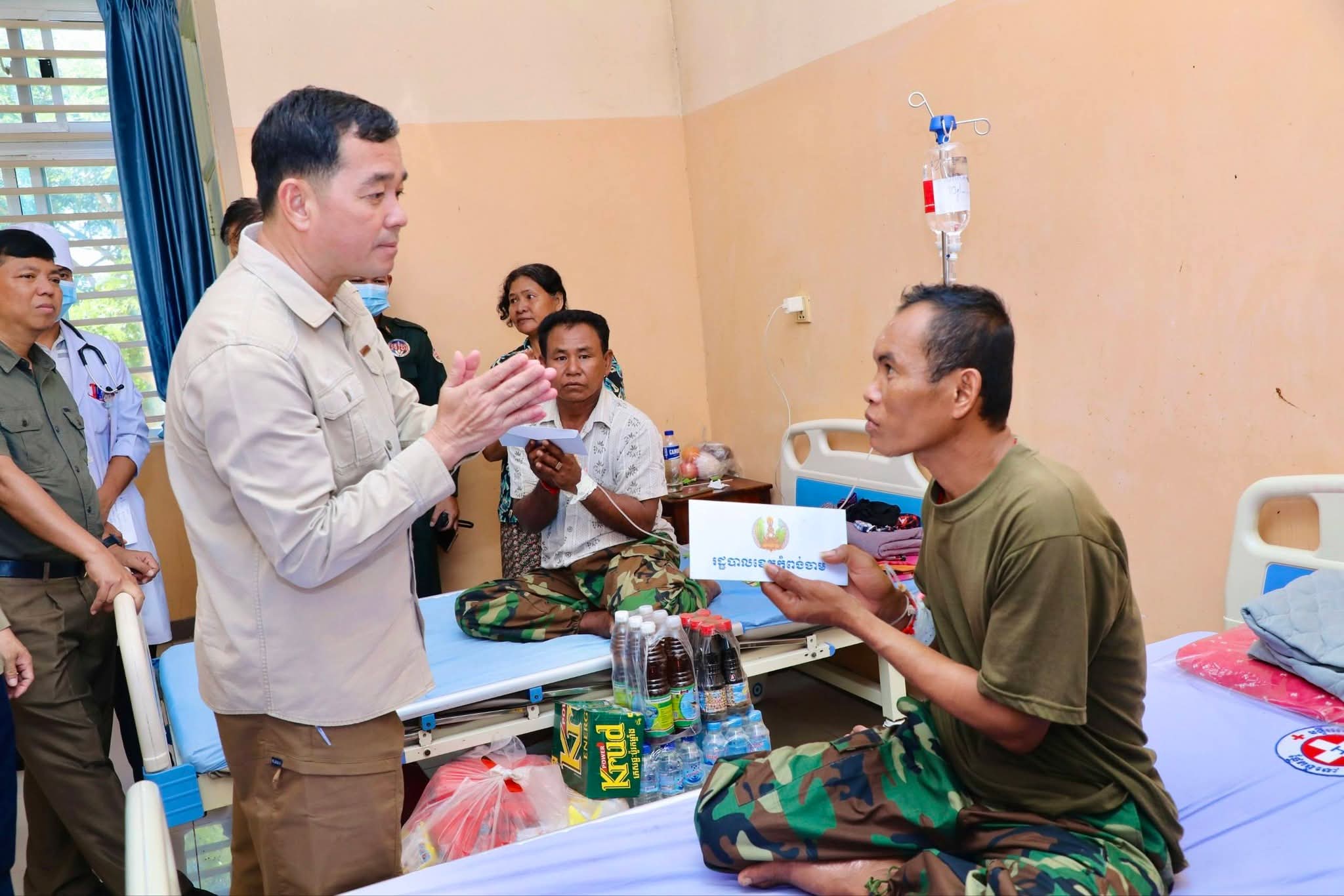 ឯកឧត្តម អភិបាលខេត្ត ថ្លែងការកោតសរសើរដល់វីរភាពដ៏អង់អាចក្លាហានរបស់វីរកងទ័ពរបស់យើង និងស្នើឲ្យបងៗ ខិតខំថែទាំសុខភាព ស្តាប់តាមការណែនាំរបស់វេជ្ជបញ្ជា ដើម្បីឆាប់បានជាសះស្បើយ នឹងអាលបានទៅបម្រើជាតិមាតុភូមិឡើងវិញ។ ទន្ទឹមនោះ ឯកឧត្តម អភិបាលខេត្ត ក៏បានផ្ដាំផ្ញើដល់ក្រុមគ្រូពេទ្យសូមយកចិត្តទុកដាក់ថែទាំ និងព្យាបាលដល់វីរកងទ័ពរបស់យើងឲ្យបានល្អប្រសើរ ដោយការចំណាយជាបន្ទុករបស់រដ្ឋបាលខេត្ត។