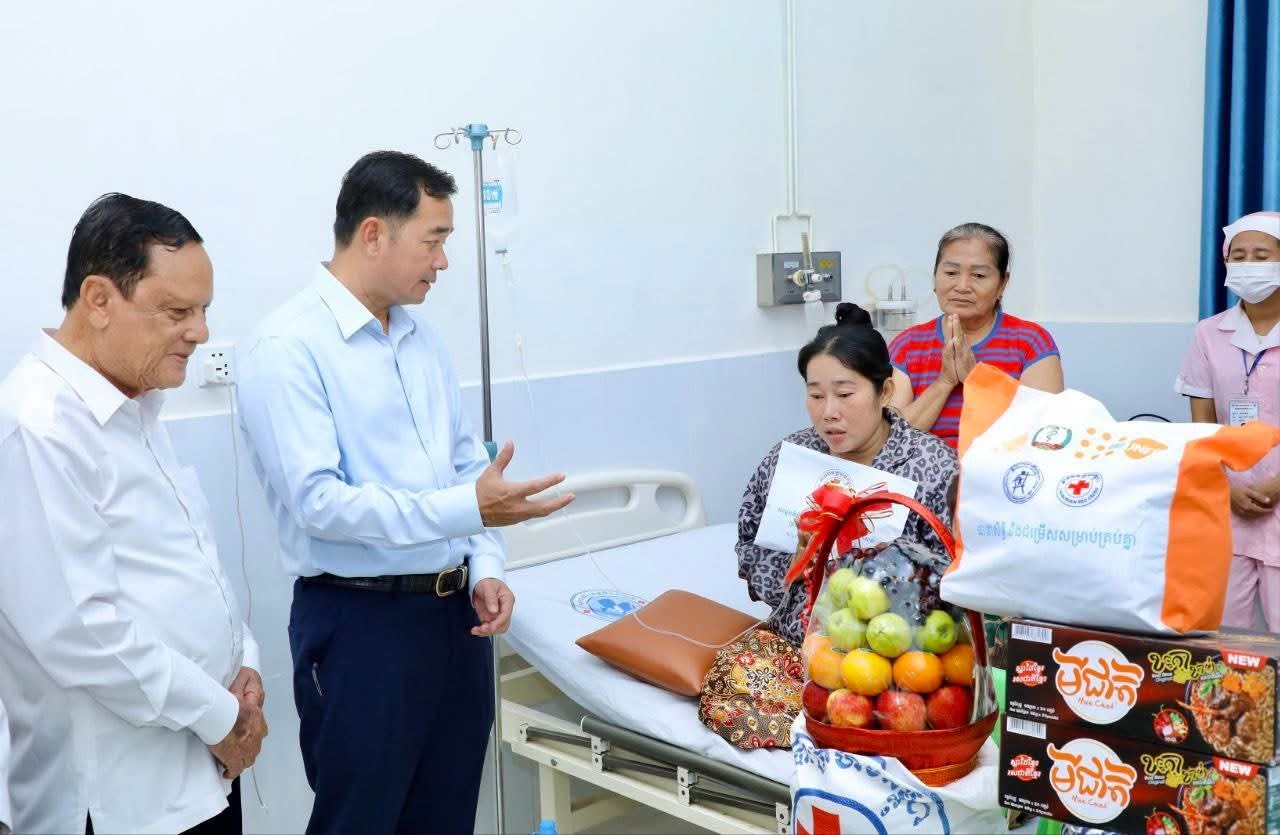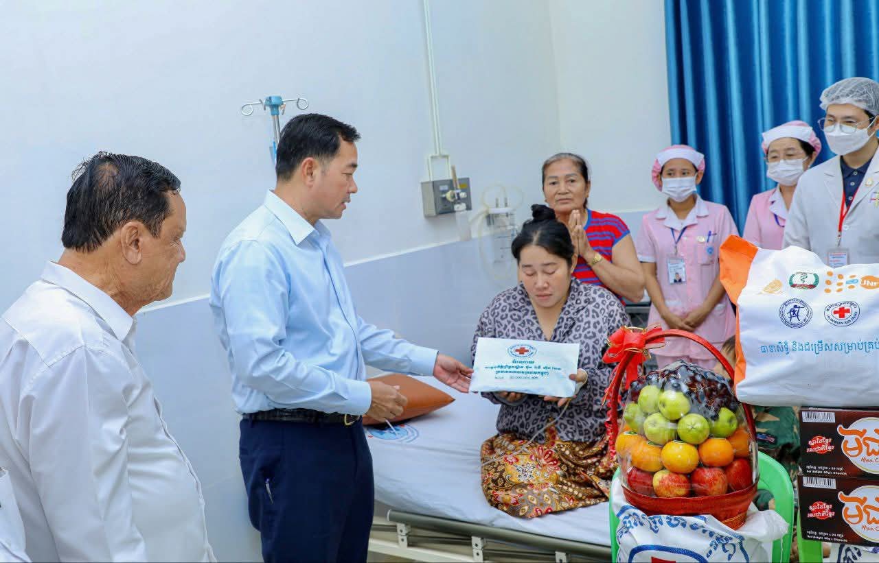 (កំពង់ចាម) :នៅព្រឹកថ្ងៃចន្ទ ទី១១ ខែសីហា ឆ្នាំ ២០២៥ នេះ ឯកឧត្តម អ៊ុន ចាន់ដា អភិបាលខេត្តកំពង់ចាម និងជាប្រធានគណៈកម្មាធិការសាខា កាកបាទក្រហមខេត្ត រួមដំណើរដោយ ឯកឧត្តម ខ្លូត ផន ប្រធានក្រុមប្រឹក្សាខេត្ត ឯកឧត្តម នាយកសាខា, ប្រធានមន្ទីរសុខាភិបាលនៃរដ្ឋបាលខេត្ត, ប្រធាន អនុប្រធានមន្ទីរពេទ្យ បានអញ្ជើញចុះសួរសុខទុក្ខ លោកស្រី ជា មួយលាភ អាយុ៣៥ឆ្នាំ ជាភរិយាយោធិនជួរមុខទិសមុំបី បានភៀសសឹកពី ភូមិសែនរុងរឿង១ ឃុំទឹកក្រហម ខេត្តព្រះវិហារ ដែលបានត្រៀមសម្រាលកូន នៅមន្ទីរពេទ្យបង្អែកខេត្តកំពង់ចាម។