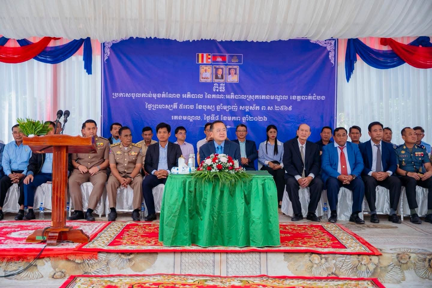 (បាត់ដំបង) : ឯកឧត្តម សុខ លូ អភិបាលនៃគណៈអភិបាលខេត្តបាត់ដំបង បានអញ្ជើញជាគណៈអធិបតីក្នុងពិធីប្រកាសចូលកាន់មុខតំណែងអភិបាលនៃគណៈអភិបាលស្រុករតនមណ្ឌល។ពិធីនេះធ្វើឡើងនៅរសៀលថ្ងៃទី៨ ខែមករា ឆ្នាំ២០២៦ នៅបរិវេណសាលាស្រុករតនមណ្ឌល ដោយមានការអញ្ជើញចូលរួមពីអភិបាលរងខេត្ត នាយករដ្ឋបាលសាលាខេត្ត ប្រធានមន្ទីរ អង្គភាព និងអាជ្ញាធរមូលដ្ឋាន។