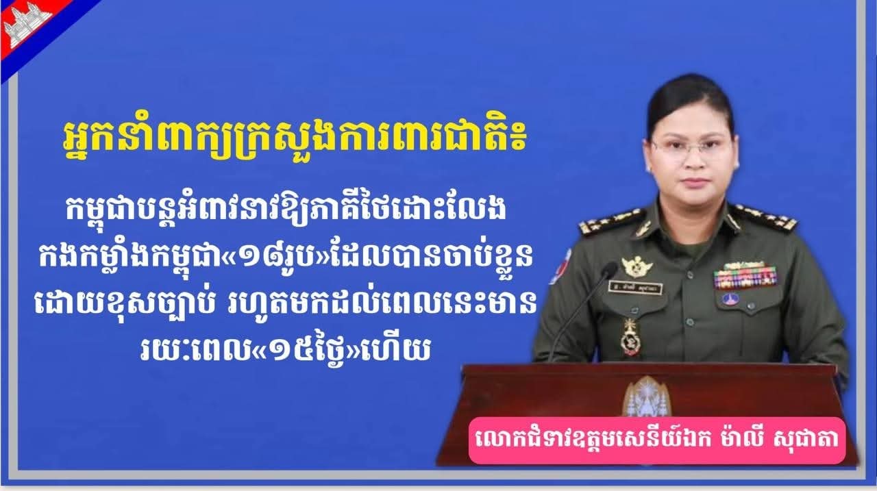 (ភ្នំពេញ) :លោកជំទាវឧត្តមសេនីយ៍ឯក ម៉ាលី សុជាតា អ្នកនាំពាក្យក្រសួងការពារជាតិថ្លែងក្នុងសេចក្តីសង្ខេបព័ត៌មានប្រចាំថ្ងៃស្តីពី «លទ្ធផលនៃការអនុវត្តបទឈប់បាញ់រវាងកម្ពុជា-ថៃ» នាព្រឹកថ្ងៃទី១៣ ខែសីហា ឆ្នាំ២០២៥ បានមានប្រសាសន៍ថា គិតចាប់តាំងពីថ្ងៃទី២៩ ខែកក្កដា ឆ្នាំ២០២៥ វេលាម៉ោង ៧:៥០ នាទីក្រោយបទឈប់បាញ់ចូលជាធរមានភ្លាមៗដែលកងកម្លាំងរបស់យើងត្រូវបានទាហានថៃចាប់ខ្លួនដោយខុសច្បាប់មកទល់ពេលនេះមានរយៈពេល ១៥ថ្ងៃហើយគិតត្រឹមថ្ងៃទី១៣ ខែសីហា ឆ្នាំ២០២៥ នេះកម្ពុជាស្នើអោយភាគីថៃឆាប់បញ្ជូនកងកម្លាំងរបស់យើងទាំង១៨រូបអោយត្រឡប់មកវិញជាបន្ទាន់ស្របតាមច្បាប់មនុស្សធម៌អន្តរជាតិ និងស្របតាមការអំពាវនាវដ៏ទទូចរបស់បណ្តាប្រទេសដៃគូ និងស្ថាប័នអន្តរជាតិជាច្រើន។
