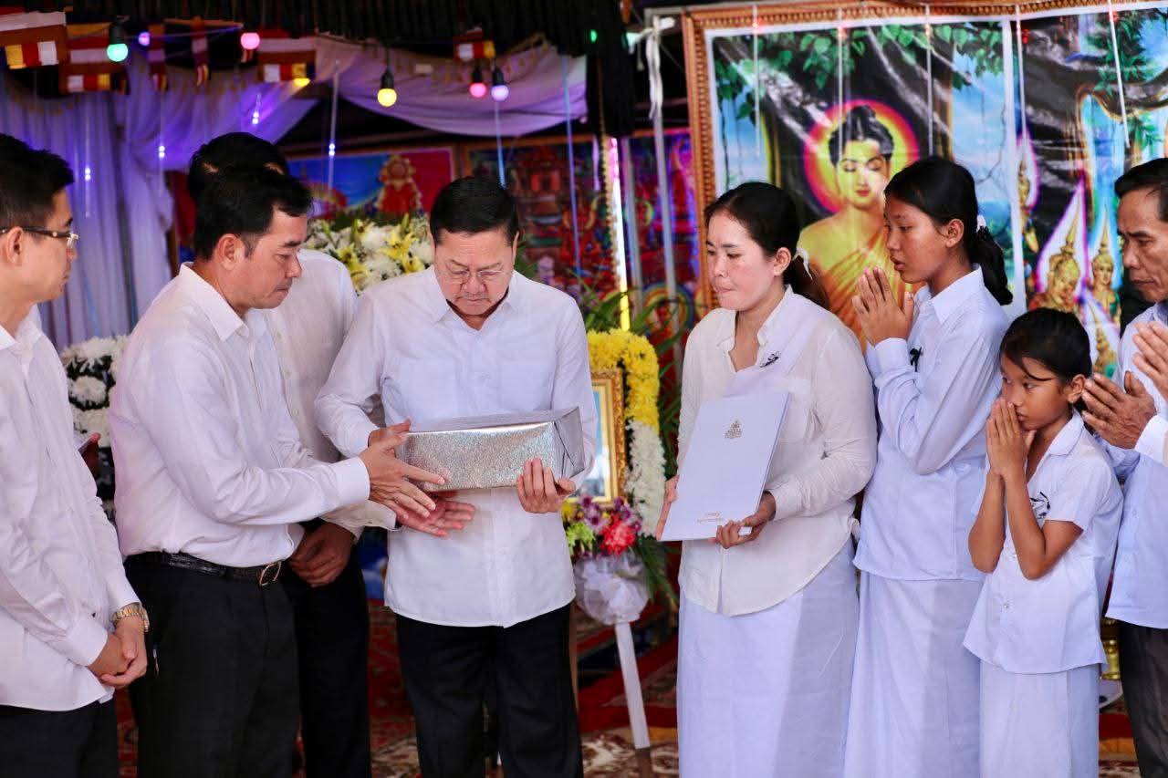 ជាមួយគ្នានោះដែរ ឯកឧត្តមសន្តិបណ្ឌិត បានណែនាំដល់ រដ្ឋបាលខេត្តកំពង់ចាម អាជ្ញាធរស្រុក ស្ទឹងត្រង់ អាជ្ញាធរមូលដ្ឋាន យកចិត្តទុកដាក់ ជួយ រៀបចំពិធីបុណ្យសពជូនចំពោះ លោក វរសេនីយ៍ ឯក សៀង សាត ទៅតាមប្រពៃណីខ្មែរ ទាំងបុណ្យ ៧ថ្ងៃ និងបុណ្យ១០០ថ្ងៃ ហើយ ក្នុងនាមរាជរដ្ឋាភិបាល ក៏បានសូមថ្លែងអំណរគុណដល់ស្ថាប័ន ធនាគារ ដែលបានសម្រេចលុបចោលបំណុលទាំងស្រុង ជូនដល់ យោធិនពលី។ឯកឧត្តមសន្តិបណ្ឌិត ក៏បានសម្រេចផ្តល់ក្របខណ្ឌ ដល់កូនស្រីរបស់វីរកងទ័ព ដែលពលីជីវិតក្នុងសមរភូមិជួរមុខ ចំនួន មួយ ១នាក់ ដោយ អនុវត្តទៅតាមប្រសាសន៍ដ៏ថ្លៃថ្លារបស់សម្តេចមហាបវរធិបតី ហ៊ុន ម៉ាណែត នាយករដ្ឋមន្ត្រី នៃព្រះរាជាណាចក្រកម្ពុជា។