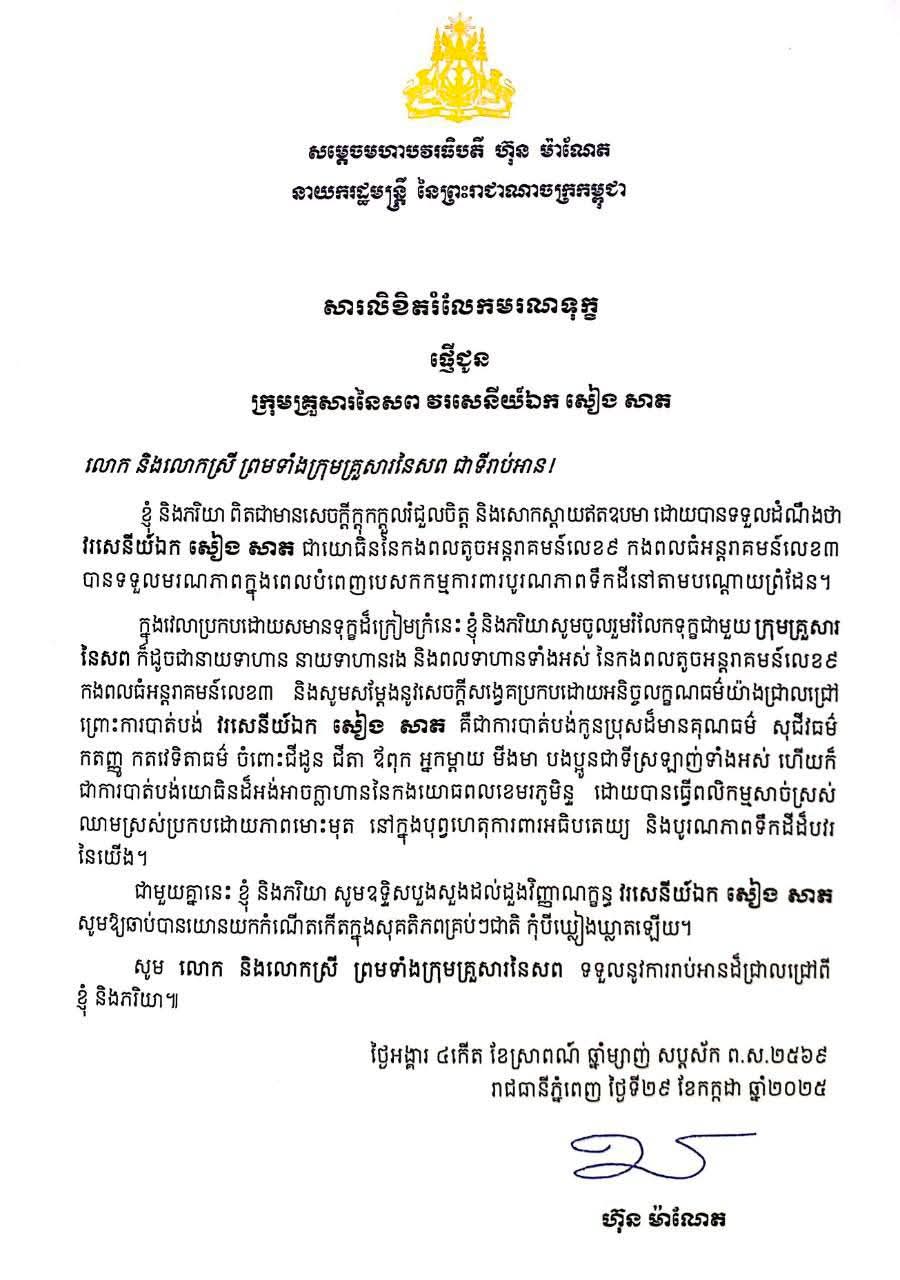 ក្នុងឱកាសដ៏សោកសង្រេង និងក្តុកក្តួលបំផុតនេះ ឯកឧត្តមសន្តិបណ្ឌិត នេត សាវឿន ក៏បានពាំនាំមកនូវការចូលរួមមរណៈទុក្ខពីសំណាក់ សម្តេចអគ្គមហាសេនាបតីតេជោ ហ៊ុន សែន ប្រធានក្រុមឧត្តមប្រឹក្សាផ្ទាល់ព្រះមហាក្សត្រ នៃព្រះរាជាណាចក្រកម្ពុជា និងសម្តេចមហាបវរធិបតី ហ៊ុន ម៉ាណែត នាយករដ្ឋមន្ត្រី នៃព្រះរាជាណាចក្រកម្ពុជា ចំពោះការលះបង់អាយុជីវិតរបស់សព លោក វរសេនីយ៍ ឯក សៀង សាត ក្នុងការការពារបូរណភាពទឹកដី និងប្រជាជនកម្ពុជា។