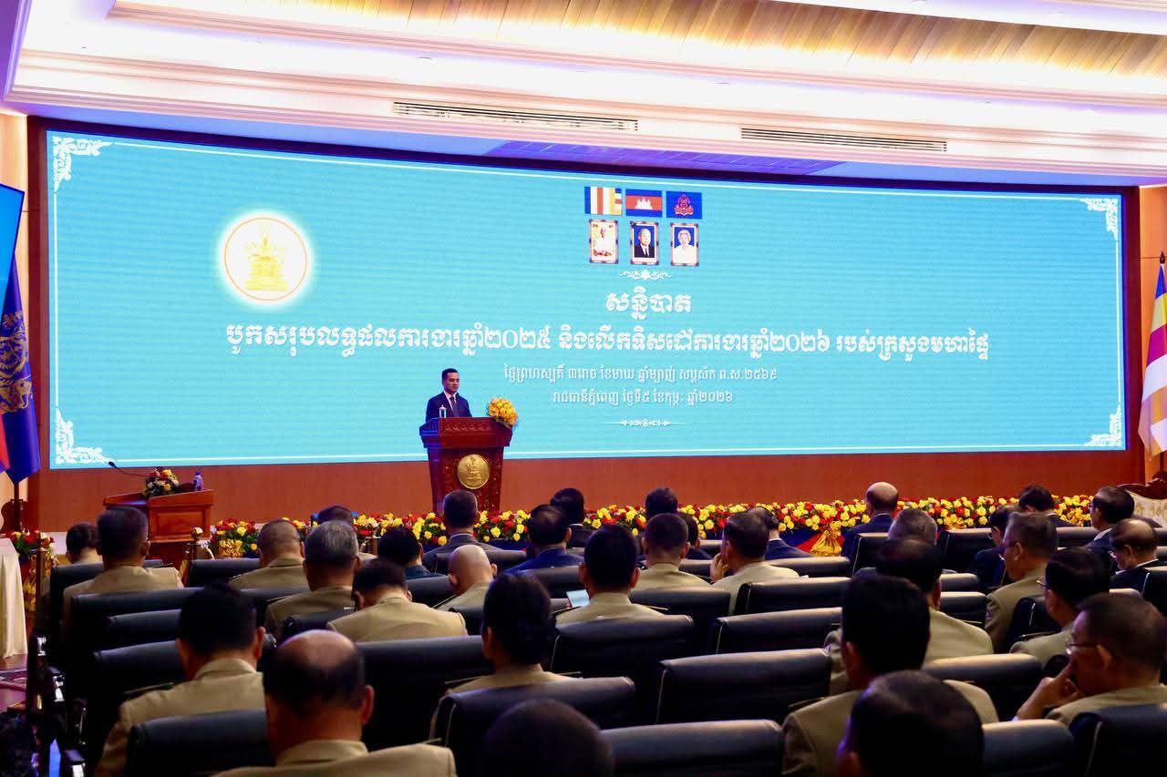 បន្ទាប់ពីបានដំណើរការរយៈពេលមួយថ្ងៃកន្លះ គិតចាប់ពីព្រឹកថ្ងៃទី៤ ខែកុម្ភៈ ម្សិលមិញ នាព្រឹកថ្ងៃទី៥ ខែកុម្ភៈ នេះ ឯកឧត្តមអភិសន្តិបណ្ឌិត ស សុខា ឧបនាយករដ្ឋមន្ត្រី រដ្ឋមន្ត្រីក្រសួងមហាផ្ទៃ បានអញ្ជើញបូកសរុបលទ្ធផលសន្និបាតត្រួតពិនិត្យលទ្ធផលការងារឆ្នាំ២០២៥ និងលើកទិសដៅការងារឆ្នាំ២០២៦ របស់ក្រសួងមហាផ្ទៃ។ ខ្លឹមសារសំខាន់ៗ នៃលទ្ធផលសន្និបាតនេះ នឹងត្រូវបានប្រមុខក្រសួងមហាផ្ទៃកម្ពុជា គោរពរាយការណ៍ជូន សម្ដេចមហាបវរធិបតី ហ៊ុន ម៉ាណែត នាយករដ្ឋមន្ត្រី នៃព្រះរាជាណាចក្រកម្ពុជា ក្នុងឱកាសដែលសម្ដេច នឹងអញ្ជើញជាអធិបតីភាពដ៏ខ្ពង់ខ្ពស់បិទសន្និបាត នារសៀលថ្ងៃដដែលនេះ។