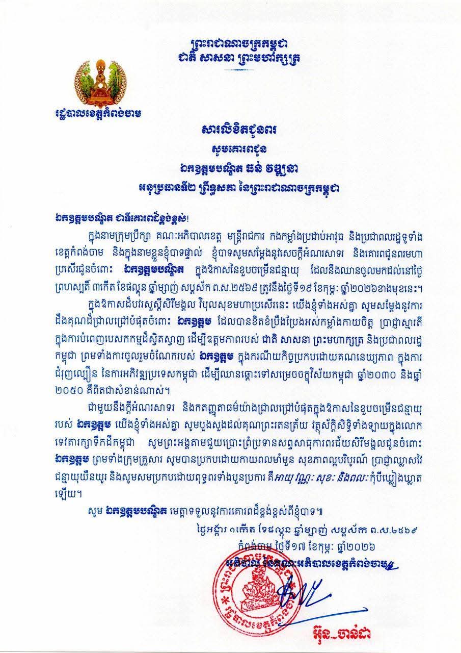 (កំពង់ចាម) :ឯកឧត្តម អ៊ុន ចាន់ដា អភិបាលនៃគណៈអភិបាលខេត្តកំពង់ចាម ផ្ញើសារលិខិតជូនពរ សូមគោរពជូនឯកឧត្តមបណ្ឌិត ធន់ វឌ្ឍនា អនុប្រធានទី២ ព្រឹទ្ធសភា នៃព្រះរាជាណាចក្រកម្ពុជា ក្នុងឱកាសខួបចម្រើនជន្មាយ 🙏❤️🎂