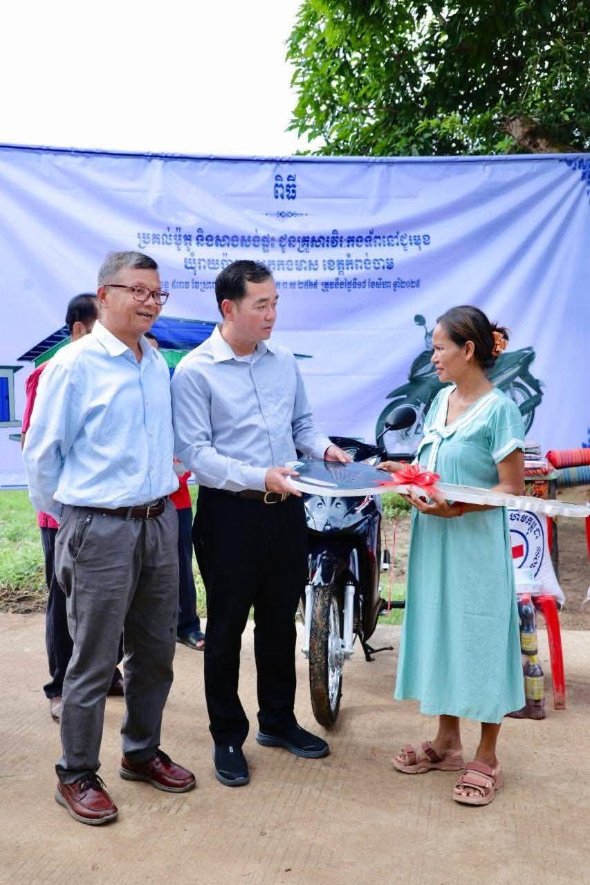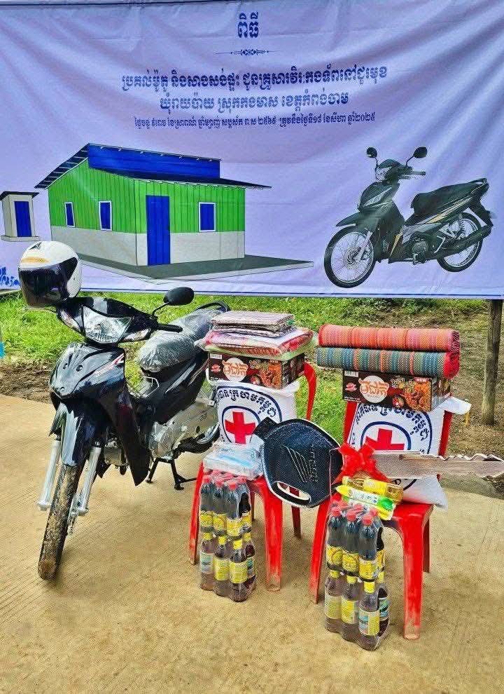 ម៉ូតូ ១គ្រឿង សម្ភារៈបរិក្ខារ គ្រឿងឧបភោគបរិភោគ និងថវិកាមួយចំនួន។ ទន្ទឹមនោះ គម្រោងផ្ទះថ្មី ១ខ្នង និងបង្គន់អនាម័យ ១បន្ទប់ ក៏ត្រូវបានចាប់ចាក់គ្រឹះព្រមគ្នាផងដែរ ដែលតាមមេជាងបានបញ្ជាក់ថា សំណង់នេះនឹងសាងសង់រួចរាល់នៅដើមខែក្រោយ។