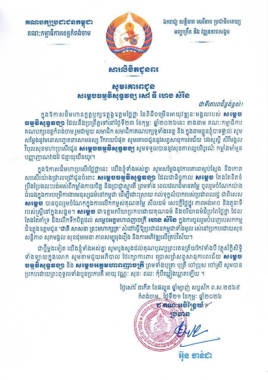 (កំពង់ចាម) :ឯកឧត្តម អ៊ុន ចាន់ដា អភិបាល នៃគណ: អភិបាលខេត្តកំពង់ចាម ផ្ញើសារលិខិតជូនពរ គោរពជូន សម្តេចធម្មវិសុទ្ធវង្សា សៅ ទី ហេងសំរិន ក្នុងឱកាសដ៏ប្រសើរថ្លៃថ្លា នៃទិវាចម្រើនជន្មាយ សម្តេចធម្មវិសុទ្ធវង្សា នៅថ្ងៃទី២៣ ខែកុម្ភៈ ឆ្នាំ២០២៦