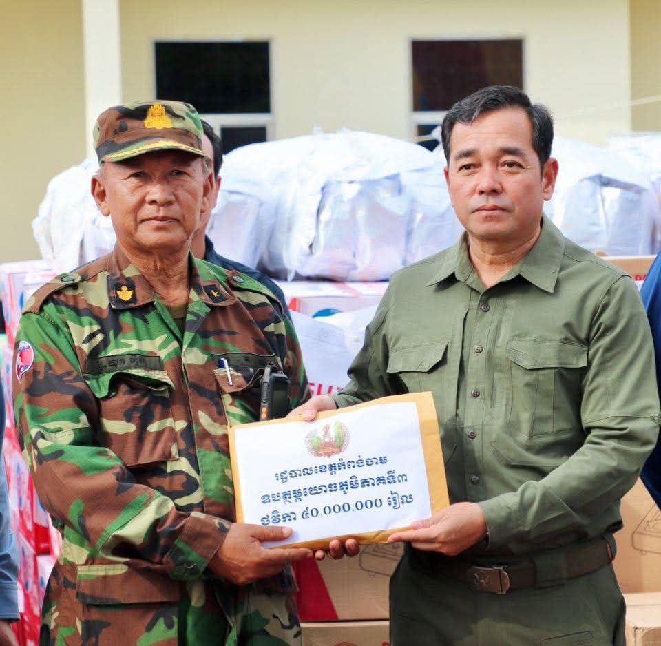 ក្នុងឱកាសនោះ ឯកឧត្តម អ៊ុន ចាន់ដា អភិបាលខេត្តកំពង់ចាម សូមថ្លែងអំណរគុណយ៉ាងជ្រាលជ្រៅចំពោះទឹកចិត្ត ថ្នាក់ដឹកនាំ មន្ត្រីរាជការ ក្រុមហ៊ុន ព្រមទាំងបងប្អូនប្រជាពលរដ្ឋ និងសប្បុរសជនគ្រប់មជ្ឈដ្ឋាន ដែលបានចូលរួមចែករំលែកធនធានទៅតាមលទ្ធលភាពរៀងៗខ្លួន តាមរយៈរដ្ឋបាលខេត្តកំពង់ចាម មកឧបត្ថម្ភដល់វីរកងទ័ពជួរមុខ និងក្រុមគ្រួសារប្រជាពលរដ្ឋដែលកំពុងជម្លៀសចេញពីផ្ទះសម្បែងមករកទីកន្លែងសុវត្ថិភាព ដែលនេះពិតជាបានបង្ហាញពីសាមគ្គីភាពជាធ្លុងមួយ ខ្មែរបេះដូងខ្មែរ ខ្មែរស្រលាញ់ខ្មែរ ខ្មែររួមឈាមជ័រតែមួយ៕