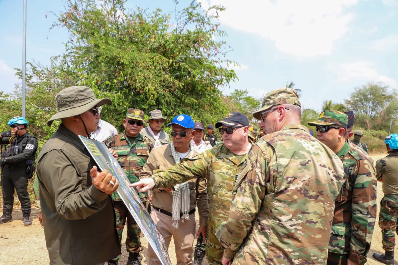 On Wednesday, March 4, 2026, at 1:00 p.m., the Ministry of National Defence of the Kingdom of Cambodia coordinated with delegations of foreign military attachés to the Kingdom of Cambodia from 12 countries to inspect the actual location in Prey Chan Village, O’ Bei Choan Commune, O’ Chrov District, Banteay Meanchey Province. The visit aimed to observe the site of the attack, the barbed wire installation, the illegal installation of shipping containers by the Thai military, and to assess the status of the implementation of the ceasefire between Cambodia and Thailand, which came into effect at 12:00 p.m. on December 27, 2025.