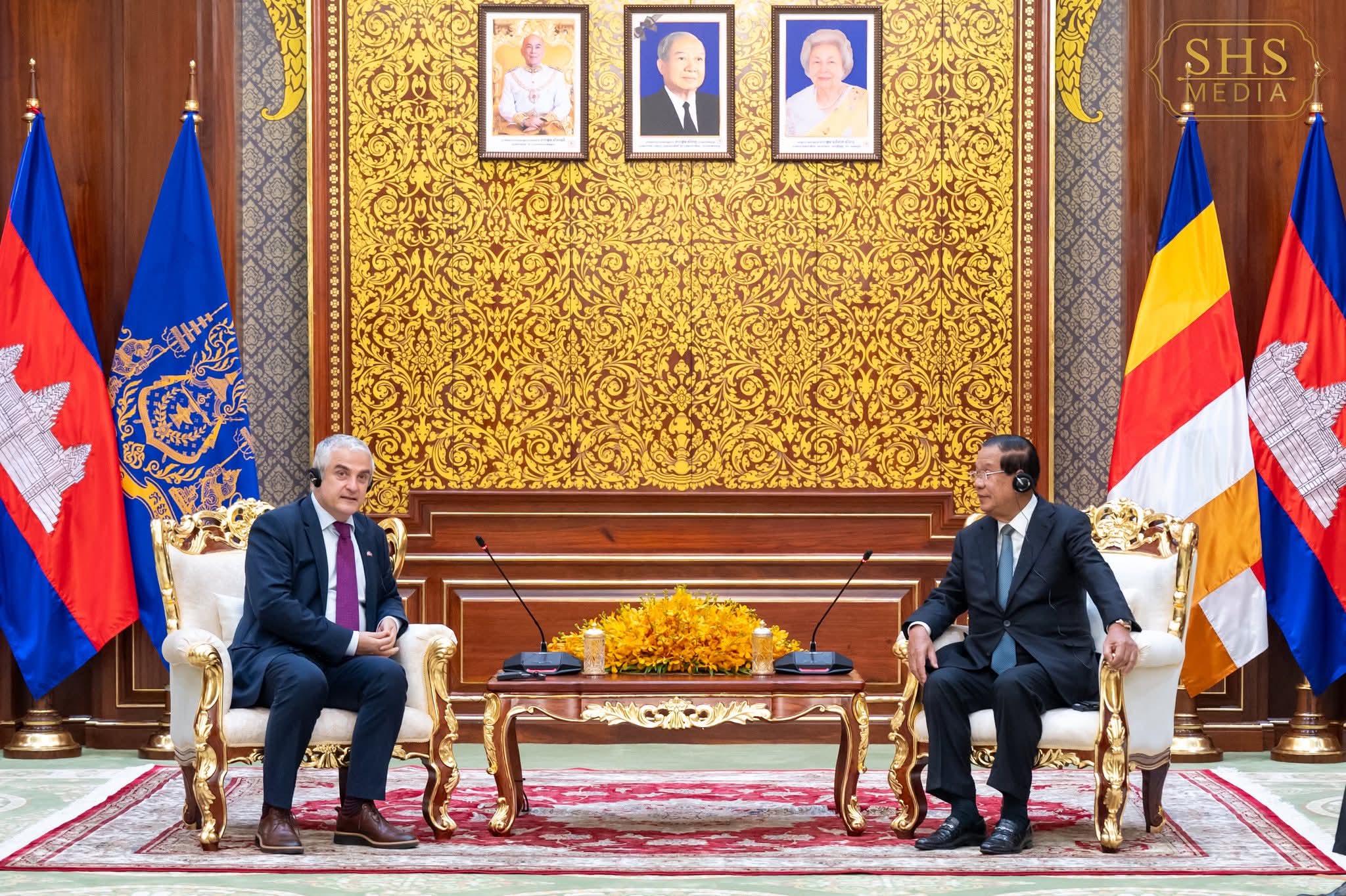 (ភ្នំពេញ) :នៅវិមានសាមគ្គីភាព នៃព្រឹទ្ធសភា នាព្រឹកថ្ងៃចន្ទ ១៣រោច ខែផល្គុន ឆ្នាំម្សាញ់ សប្តស័ក ព.ស.២៥៦៩ ត្រូវនឹងថ្ងៃទី១៦ ខែមីនា ឆ្នាំ២០២៦ សម្តេចអគ្គមហាសេនាបតីតេជោ ហ៊ុន សែន ប្រមុខរដ្ឋស្តីទីនៃព្រះរាជាណាចក្រកម្ពុជា បានអនុញ្ញាតឱ្យ ឯកឧត្តម ដែននី អានណាន (Danny Annan) ឯកអគ្គរាជទូតនៃព្រះរាជាណាចក្រដាណឺម៉ាក ប្រចាំនៅកម្ពុជា ចូលជួបសម្តែងការគួរសម និងពិភាក្សាការងារ។