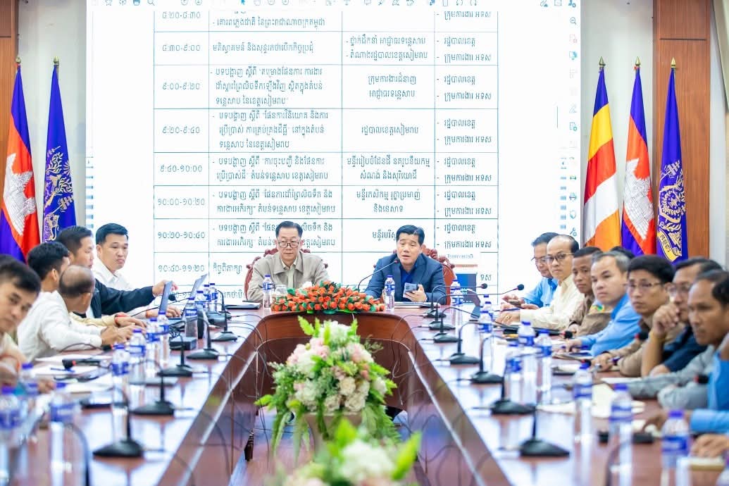 ខេត្តសៀមរាប: ដោយទទួលបានការណែនាំ និងចង្អុលបង្ហាញដ៏ខ្ពង់ខ្ពស់របស់ ឯកឧត្តម ថោ ជេដ្ឋា រដ្ឋមន្រ្តីក្រសួងធនធានទឹក និងឧតុនិយម និង ជាប្រធានអាជ្ញាធរទន្លេសាប ឯកឧត្តម ខូវ មាស អគ្គលេខាធិការរង នៃអាជ្ញាធរទន្លេសាប និងជាអនុប្រធានក្រុមការងារទទួលទុកអនុវត្តការងារដាំស្តារព្រៃលិចទឹកខេត្តទាំង៦ជុំវិញតំបន់ទន្លេសាប និង លោក អ៉ឹង គឹមលាង អភិបាលរងខេត្ត តំណាងឯកឧត្តម ប្រាក់ សោភ័ណ អភិបាលនៃគណៈអភិបាលខេត្ត បានដឹកនាំកិច្ចប្រជុំពិភាក្សាស្តីពីការរៀបចំផែនការដាំស្តារព្រៃលិចទឹកឡើងវិញនៅតំបន់ជុំវិញបឹងទន្លេសាប ក្នុងភូមិសាស្ត្រខេត្តសៀមរាប ដោយមានការរួមពីមន្ត្រីជំនាញនៃអាជ្ញាធរ ទន្លេសាប មន្ទីរជំនាញពាក់ព័ន្ធ រួមទាំងអាជ្ញាធរក្រុង ស្រុក ឃុំ សង្កាត់ពាក់ព័ន្ធតំបន់បឹងទន្លេសាប ដែលមានសមាសភាពសរុបចំនួន ៤៦ រូប នៅសាលប្រជុំសាលាខេត្តសៀមរាប ព្រឹកថ្ងៃទី១៦ ខែមីនា ឆ្នាំ២០២៦ ។