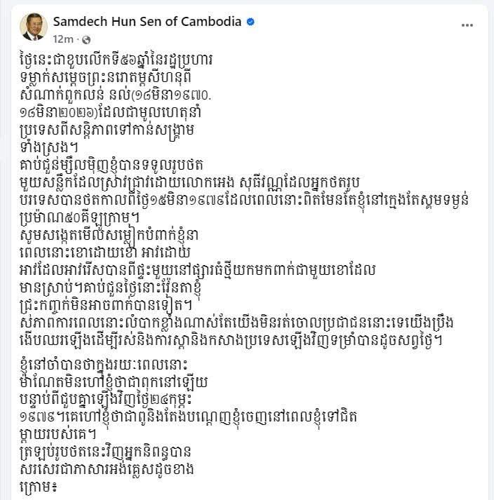 (ភ្នំពេញ) :សម្តេចតេជោ ហ៊ុន សែន ប្រធានព្រឹទ្ធសភានៃកម្ពុជា តាមរយៈបណ្តាញសង្គមនៅព្រឹកថ្ងៃទី១៨ ខែមីនា ឆ្នាំ២០២៦ បានបង្ហោះខ្លឹមសារអមដោយរូបថតមួយសន្លឹក ដែលបានរំលឹកពីប្រវត្តិអតីតកាលរបស់កម្ពុជា ដែលបានឆ្លងកាត់រដ្ឋប្រហារនិងសង្រ្គាម ដែលមានខ្លឹមសារថា៖