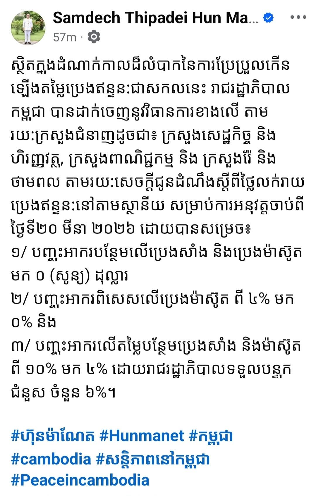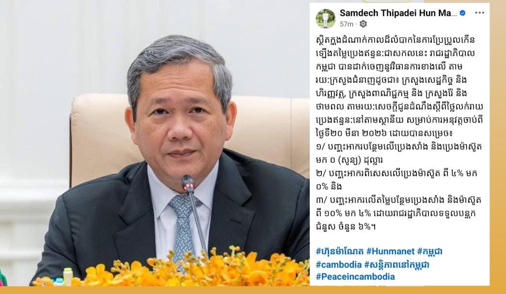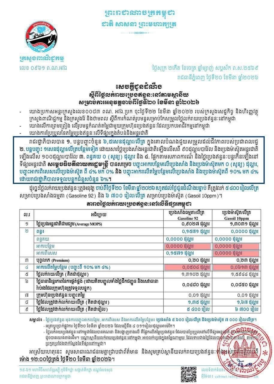 (ភ្នំពេញ) :យោងតាមការបង្ហោះផ្សាយនៅក្នុងបណ្ដាញសង្គមរបស់សម្ដេចធិបតី ហ៊ុន ម៉ាណែត នាយករដ្ឋមន្ត្រីនៃព្រះរាជាណាចក្រកម្ពុជានៅថ្ងៃទី២១ ខែមីនា ឆ្នាំ២០២៦ បានឱ្យដឹងថា ស្ថិតក្នុងដំណាក់កាលដ៏លំបាកនៃការប្រែប្រួលកេីនឡេីងតម្លៃប្រេងឥន្ទន:ជាសកលនេះ រាជរដ្ឋាភិបាលកម្ពុជា បានដាក់ចេញនូវវិធានការខាងលេី តាមរយ:ក្រសួងជំនាញដូចជា៖ ក្រសួងសេដ្ឋកិច្ច និងហិរញ្ញវត្ថុ, ក្រសួងពាណិជ្ជកម្ម និង ក្រសួងរ៉ែ និងថាមពល តាមរយ:សេចក្តីជូនដំណឹងស្តីពីថ្លៃលក់រាយប្រេងឥន្ទន:នៅតាមស្ថានីយ សម្រាប់ការអនុវត្តចាប់ពីថ្ងៃទី២០ មីនា ២០២៦ ដោយបានសម្រេច៖