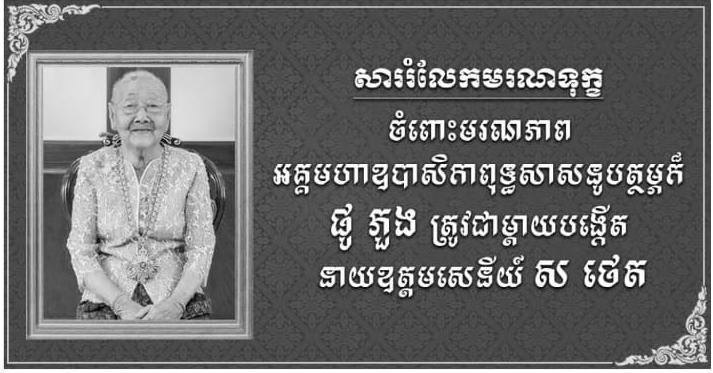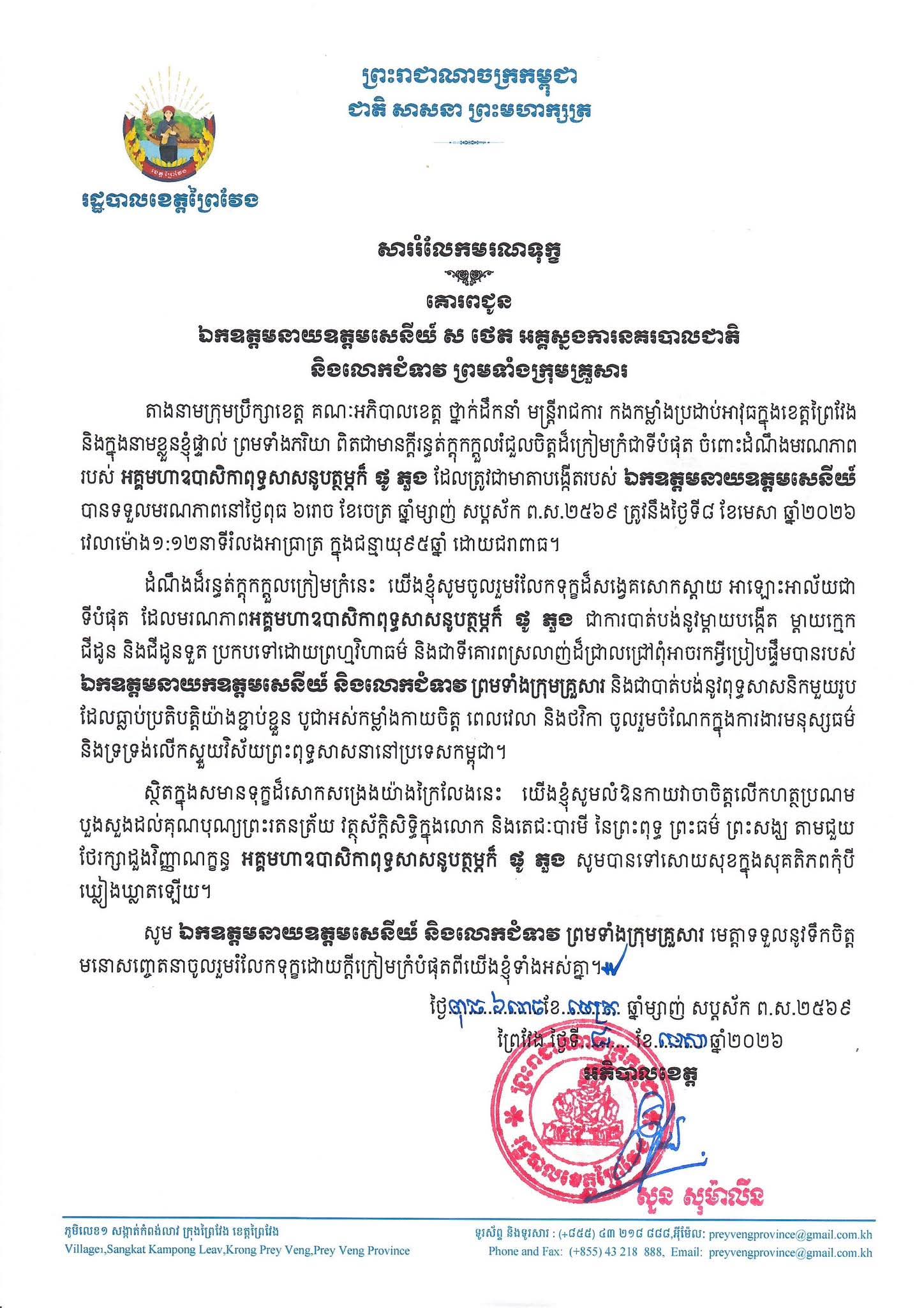ខេត្តព្រៃវែង: ឯកឧត្តម សួន សុម៉ាលីន អភិបាលនៃគណៈអភិបាលខេត្តព្រៃវែង និងលោកជំទាវ ព្រមទាំងក្រុមគ្រួសារ ព្រមទាំងមន្ដ្រីរាជការ និងកងកម្លាំងប្រដាប់អាវុធ និងប្រជាពលរដ្ធទូទាំងខេត្ត សូមផ្ញើសារចូលរួមរំលែកមរណ:ទុក្ខយ៉ាងក្រៀមក្រំ គោរពជូនចំពោះ ឯកឧត្តមនាយឧត្តមសេនីយ៍ ស ថេត អគ្គស្នងការនគរបាលជាតិ និងលោកជំទាវ ព្រមទាំងក្រុមគ្រួសារ ចំពោះមរណភាពរបស់អគ្គមហាឧបាសិកាពុទ្ធសាសនូបត្ថម្ភក៍ ផូ ភួង ដែលត្រូវជាមាតាបង្កើរបស់ ឯកឧត្តមនាយឧត្តមសេនីយ៍ ដែលបានទទួលមរណភាព នៅថ្ងៃពុធ ៦រោច ខែចេត្រ ឆ្នាំម្សាញ់ សប្តស័ក ព.ស.២៥៦៩ ត្រូវនឹងថ្ងៃទី៨ ខែមេសា ឆ្នាំ២០២៦ វេលាម៉ោង ១:១២ នាទីរំលងអាធ្រាត្រ ក្នុងជន្មាយុ ៩៥ឆ្នាំ ដោយជរាពាធ។