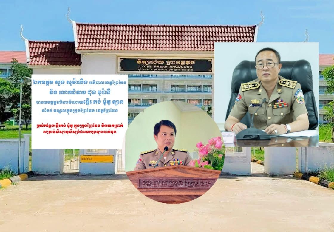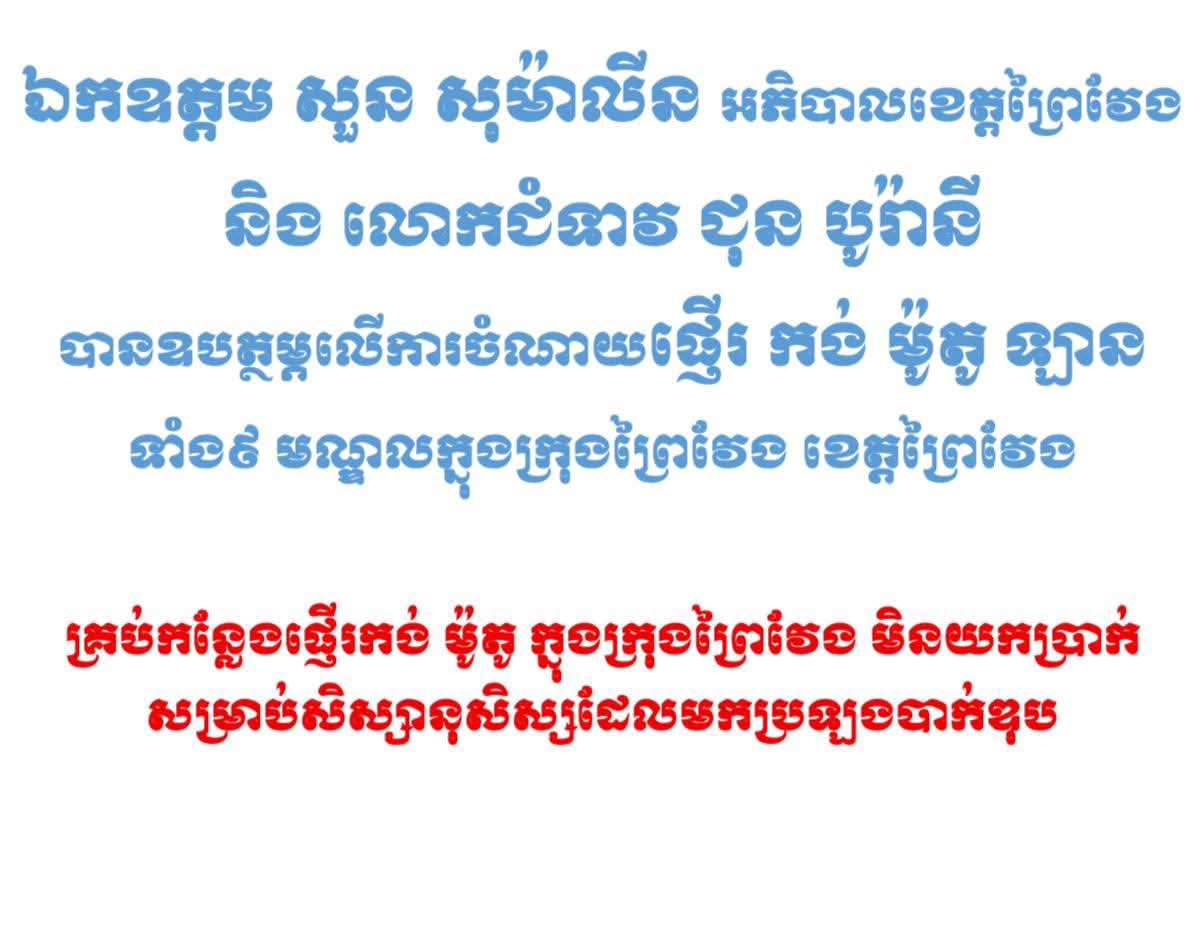 (ព្រៃវែង) : លោក ម៉ននី បណ្ឌិត អភិបាលនៃគណ:អភិបាលក្រុងព្រៃវែង នៅថ្ងៃទី២៧ ខែសីហា ឆ្នាំ២០២៥ សូមគោរពថ្លែងអំណរគុណ ឯកឧត្តម សួន សុម៉ាលីន អភិបាល នៃគណៈអភិបាលខេត្តព្រៃវែង និងលោកជំទាវ ជុន បូរ៉ានី ដែលបានឧបត្ថម្ភលើ ការចំណាយផ្ញើរ កង់ ម៉ូតូ ឡាន ទាំង៩មណ្ឌលក្នុងក្រុងព្រៃវែង ខេត្តព្រៃវែង។