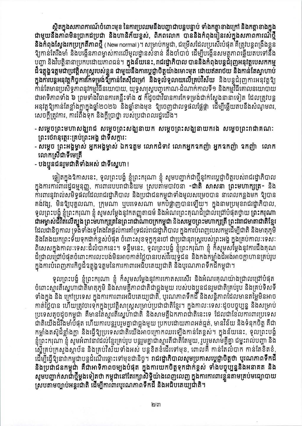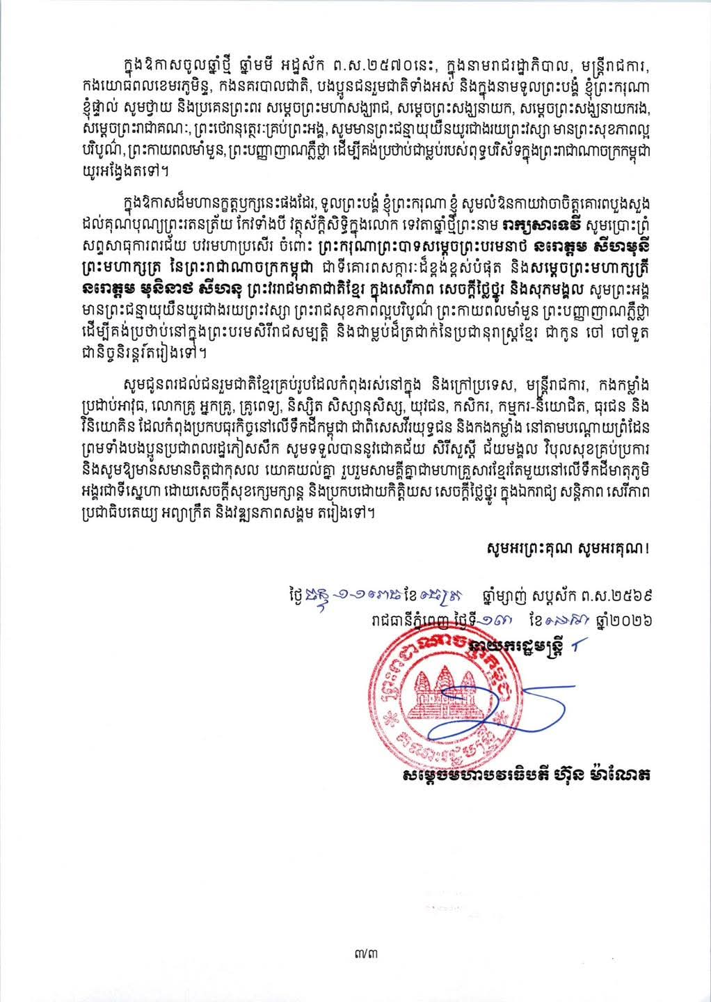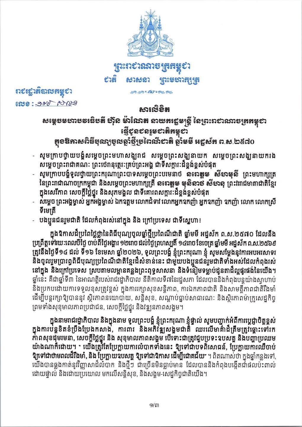សារលិខិត សម្តេចមហាបវរធិបតី ហ៊ុន ម៉ាណែត នាយករដ្ឋមន្ត្រី នៃកម្ពុជា ផ្ញើជូនជនរួមជាតិកម្ពុជា ក្នុងឱកាសពិធីបុណ្យចូលឆ្នាំថ្មី ប្រពៃណីជាតិ