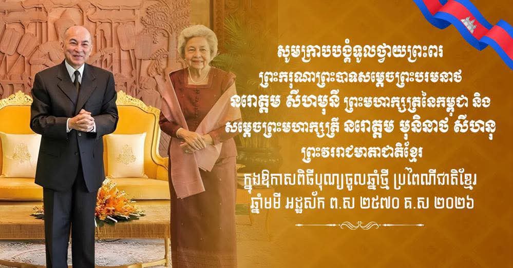(ភ្នំពេញ) :ទូលព្រះបង្គំជាខ្ញុំ រ័ត្ន ស្រ៊ាង មេបញ្ជាការរងកងរាជអាវុធហត្ថលើផ្ទៃប្រទេស និងជាមេបញ្ជាការកងរាជអាវុធហត្ថរាជធានីភ្នំពេញ សូមព្រះបរមរាជានុញ្ញាត ក្រាបបង្គំទូលថ្វាយព្រះពរ ព្រះករុណាព្រះបាទសម្តេចព្រះបរមនាថ នរោត្តម សីហមុនី ព្រះមហាក្សត្រនៃកម្ពុជា និងសម្ដេចព្រះមហាក្សត្រី នរោត្តម មុនិនាថ សីហនុ ព្រះវររាជមាតាជាតិខ្មែរ ជាទីគោរពសក្ការៈដ៏ខ្ពង់ខ្ពស់បំផុត នៅក្នុងឱកាសពិធីបុណ្យចូលឆ្នាំថ្មី ប្រពៃណីជាតិខ្មែរ ឆ្នាំមមី អដ្ឋស័ក ពុទ្ធសករាជ ២៥៦៩ ត្រូវនឹងថ្ងៃទី ១៤-១៥-១៦ ខែមេសា ឆ្នាំ២០២៦ សូមព្រះអង្គទ្រង់ប្រកបដោយព្រះកាយពលរឹងមាំខ្លាំងក្លា ព្រះបញ្ញាញាណភ្លឺថ្លាត្រចះត្រចង់ ព្រះរាជសុខភាពល្អបរិបូរណ៍ ព្រះជន្មាយុយឺនយូរជាងរយព្រះវស្សា ចាកផុតពីព្រះរោគាព្យាធិ ដើម្បីព្រះអង្គទ្រង់គង់ប្រថាប់នៅក្នុងព្រះបរមសិរីរាជសម្បត្តិ ជាព្រះម្លប់ដ៏ត្រជាក់ត្រជុំ សម្បូរសប្បាយ ចម្រុងចម្រើន ថ្កុំថ្កើងរុងរឿងរបស់មាតុភូមិកម្ពុជាជាទីស្នេហា និងប្រជានុរាស្ត្រ ដើម្បីបន្តព្រះរាជបេសកកម្មដ៏ឧត្តុង្គឧត្តម។