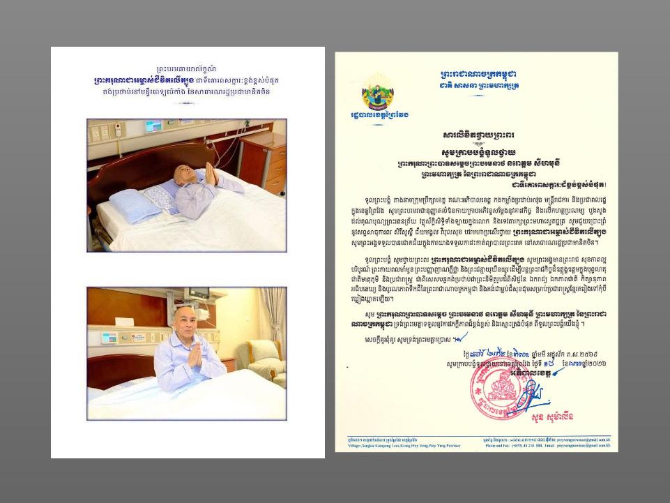 ខេត្តព្រៃវែង: ទូលព្រះបង្គំ សួន សុម៉ាលីន អភិបាល នៃគណ: អភិបាលខេត្តព្រៃវែង តាងនាមក្រុមប្រឹក្សាខេត្ត គណ:អភិបាលខេត្ត កងកម្លាំង ប្រដាប់អាវុធ មន្ដ្រីរាជការ និងប្រជាពលរដ្ធក្នុងខេត្តព្រៃវែង 🙏សូមព្រះបរមរាជជាអនុញ្ញាតលំឱកាយក្រាបអភិវន្ទសម្ដែងនូវគារវកិច្ច និងលើកហត្ថប្រណម្យ បួងសួងដល់គុណបុណ្យព្រះតេនត្រ័យ វត្ថុស័ក្តិសិទ្ធទាំងឡាយក្នុងលោក និងទេវតារក្សាព្រះមហាស្វេតច្ឆត្រ សូមជួយប្រោះព្រំនូវសព្ឌសាធុការពរ សិរីសួស្ដី ជ័យមង្គល វិបុលសុខ បវមហាប្រសើរថ្វាយ ព្រះករុណាជាអម្ចាស់ជីវិតលើត្បូង សូមព្រះអង្គទទួលបានជោគជ័យក្នុងការយាងទទួលការវ:កាត់ព្យាបាលព្រះរោគ នៅសាធារណរដ្ធប្រជាមានិតចិន។