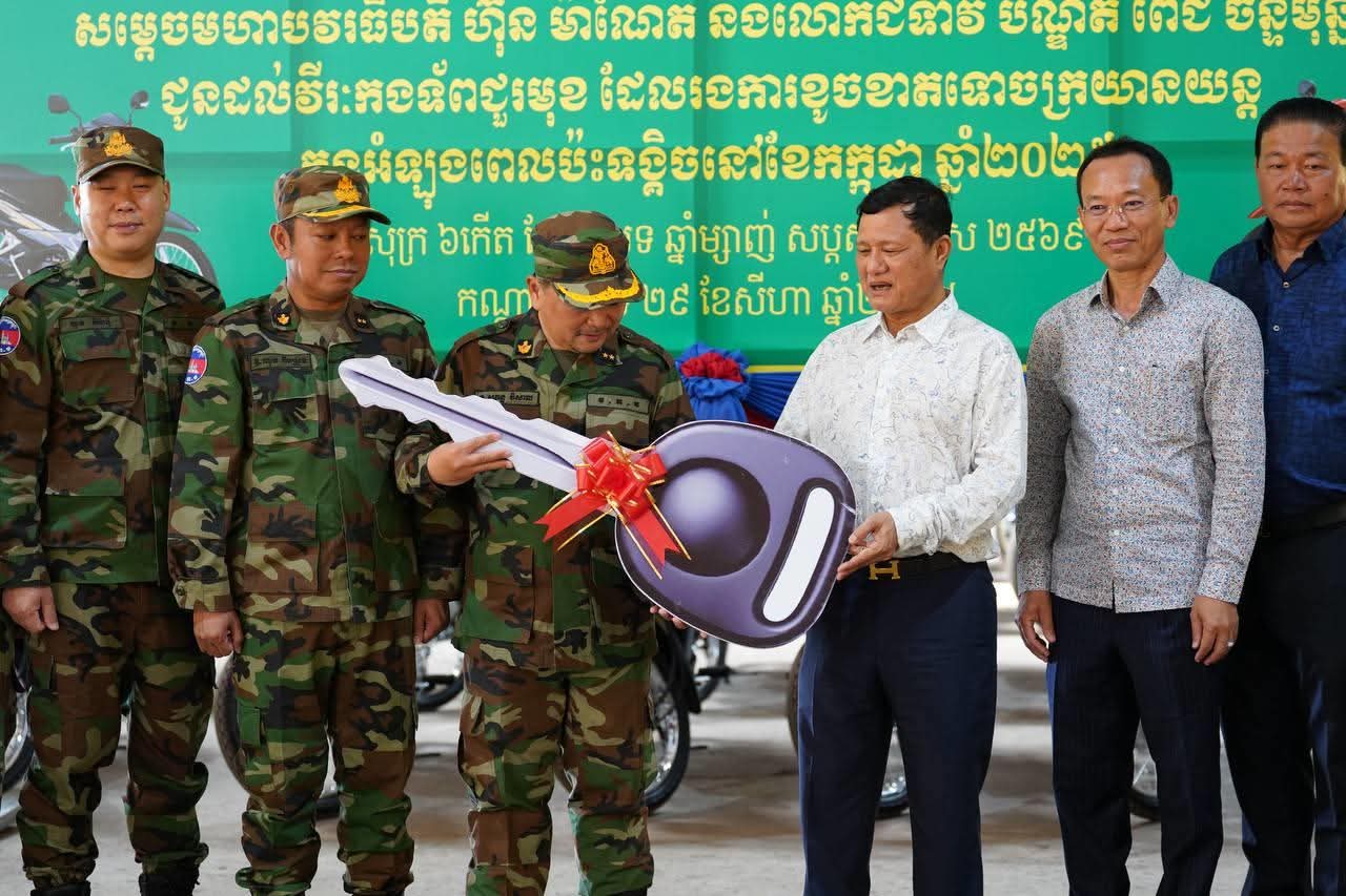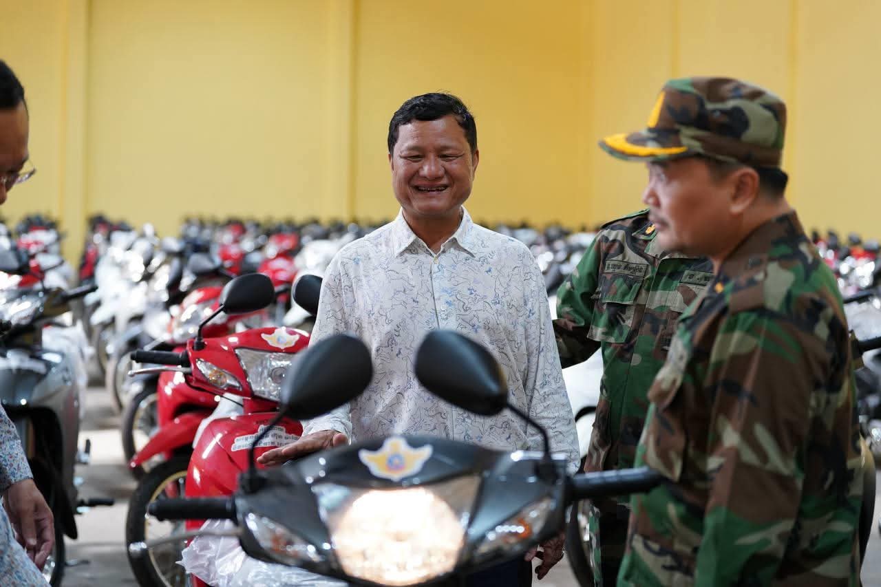 (ភ្នំពេញ) :សម្តេចមហាបវរធិបតី ហ៊ុន ម៉ាណែត នាយករដ្ឋមន្ត្រីកម្ពុជា និងលោកជំទាវបណ្ឌិត ពេជ ចន្ទមុន្នី ហ៊ុនម៉ាណែត តាមរយៈលោកអ្នកឧកញ៉ា ទ្រី ភាព បេសកជនពិសេសរបស់សម្តេចតេជោ ហ៊ុន សែន ប្រធានព្រឹទ្ធសភាកម្ពុជា និងលោកជំទាវឧកញ៉ា គៀន ស្រីនា បានឧបត្ថម្ភម៉ូតូចំនួន ១ពាន់គ្រឿងជូនដល់កងទ័ពជួរមុខ ក៏ដូចជាអង្គភាពទ័ពប្រើប្រាស់តាមតម្រូវការចាំបាច់លើកិច្ចការពារជាតិ។