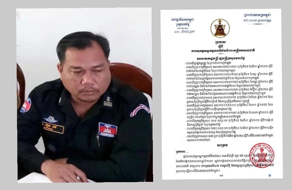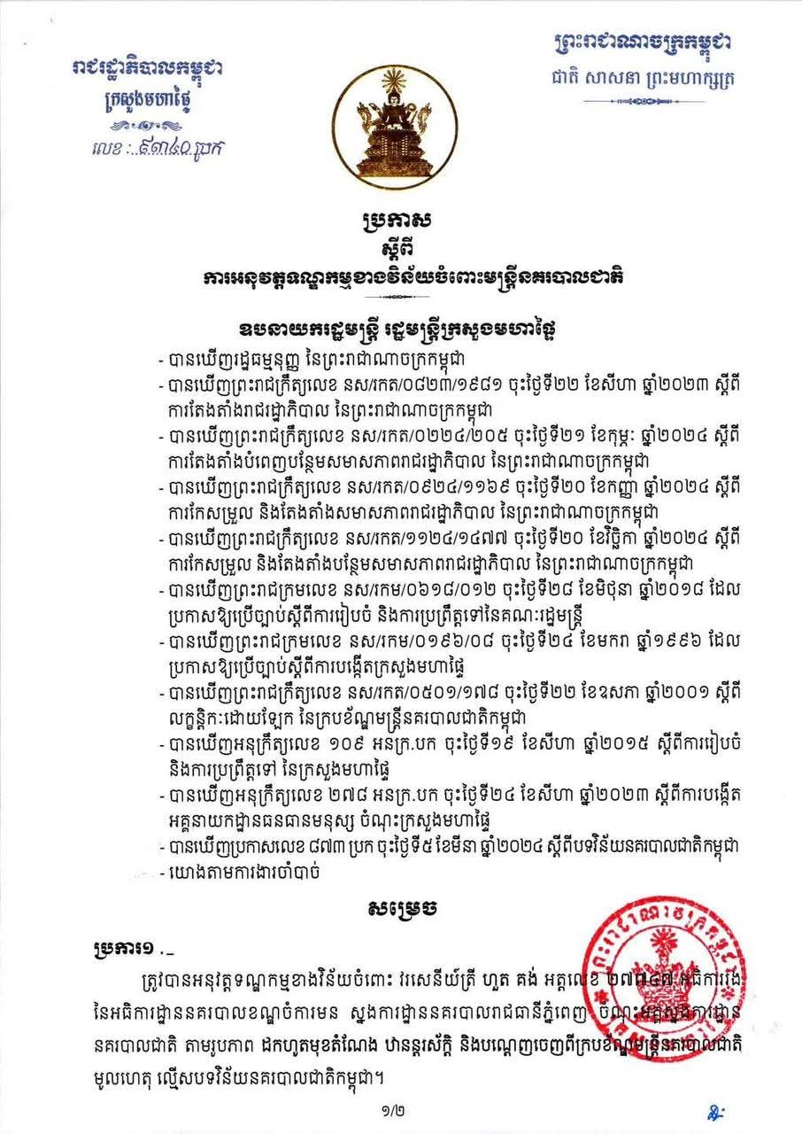 (ភ្នំពេញ) : លោកវរសេនីយ៍ត្រី ហួត គង់ អធិការរងនគរបាលខណ្ឌចំការមន ត្រូវបានឧបនាយករដ្ឋមន្ដ្រី ស សុខា រដ្ឋមន្ដ្រីក្រសួងមហាផ្ទៃ ដកហូតមុខតំណែង និងបណ្ដេញចេញពីក្របខ័ណ្ឌមន្ដ្រីនគរបាលជាតិកម្ពុជា។ នេះបើតាមប្រកាសរបស់ក្រសួងមហាផ្ទៃ នៅថ្ងៃទី៣១ ខែសីហា ឆ្នាំ២០២៥។