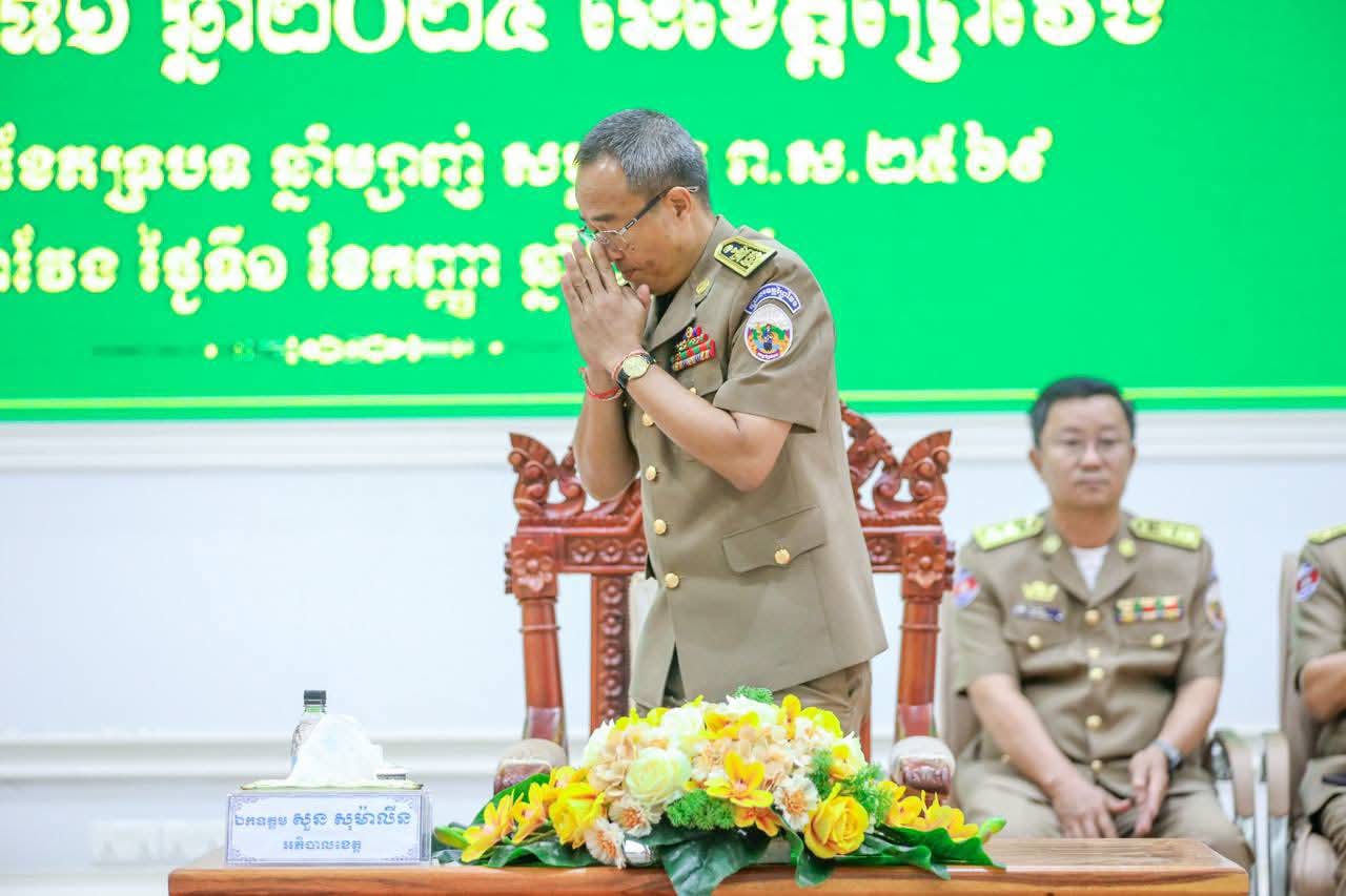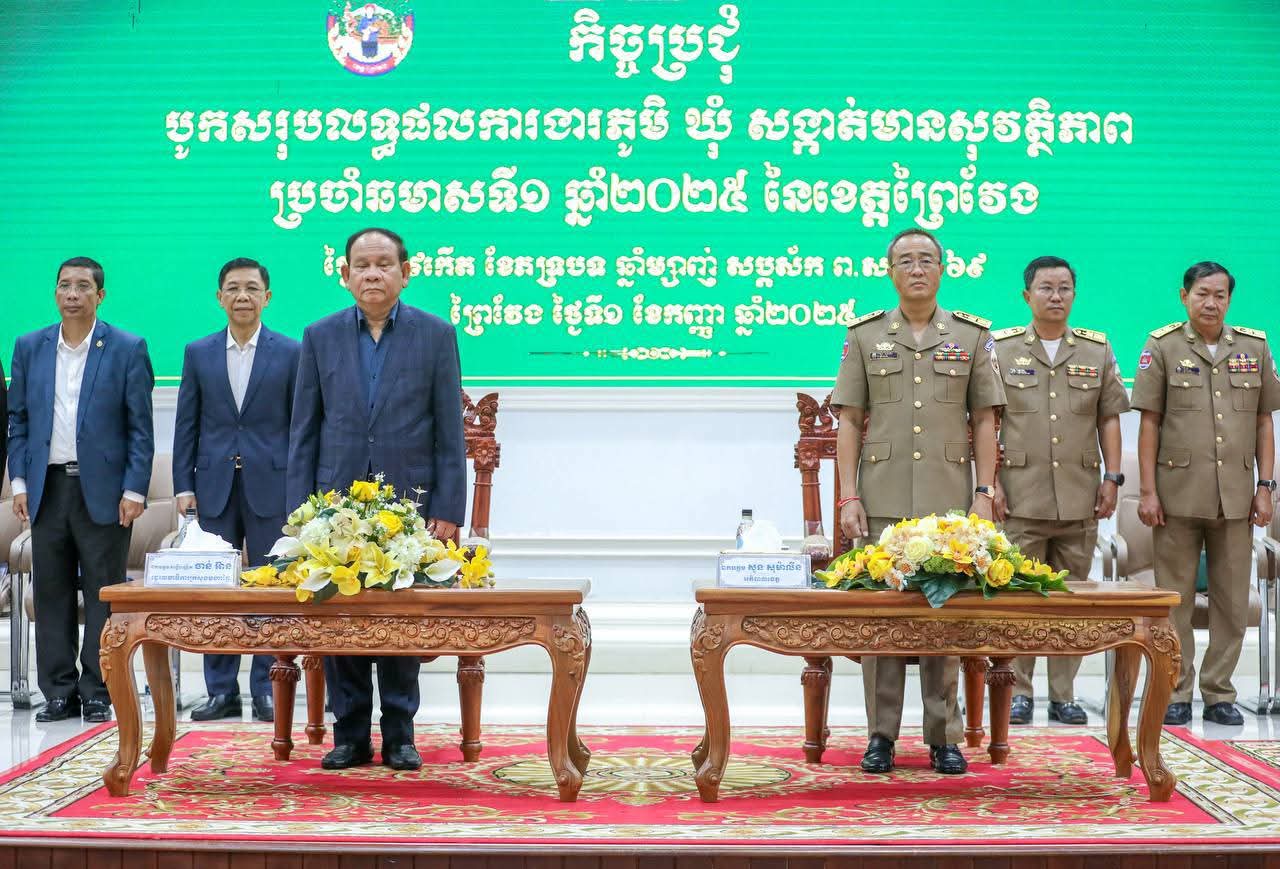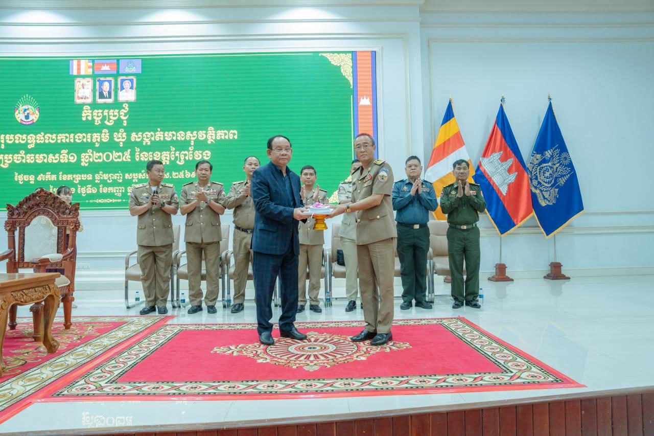(ព្រៃវែង) : នាព្រឹកថ្ងៃចន្ទ ៩កើត ខែភទ្របទ ឆ្នាំម្សាញ់ សប្តស័ក ពុទ្ធសករាជ ២៥៦៩ ត្រូវនឹងថ្ងៃទី០១ ខែកញ្ញា ឆ្នាំ២០២៥នេះ រដ្ឋបាលខេត្តព្រៃវែង បានរៀបចំកិច្ចប្រជុំបូកសរុបលទ្ធផលការងារភូមិ-ឃុំ-សង្កាត់ មានសុវត្ថិភាព ប្រចាំឆមាសទី១ ឆ្នាំ២០២៥ នៃខេត្តព្រៃវែ ក្រោមអធិបតីភាពដ៏ខ្ពង់ខ្ពស់ ឯកឧត្តមសន្តិបណ្ឌិត ចាន់ អ៊ាន រដ្ឋលេខាធិការ ក្រសួងមហាផ្ទៃ និងឯកឧត្តម សួន សុម៉ាលីន អភិបាលនៃគណៈអភិបាលខេត្ត ដែលប្រព្រឹត្តទៅនៅសាលប្រជុំធំ «A» សាលាខេត្តព្រៃវែង។