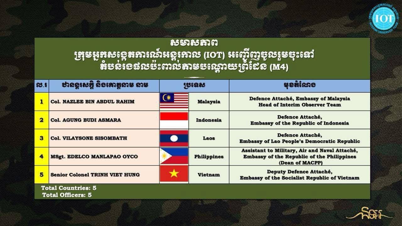 គួរបញ្ជាក់ផងដែរថា បេសកកម្មរបស់ក្រុមអ្នកសង្កេតការណ៍ អន្តរកាល (IOT) ខាងលើនេះគឺ បានកើតចេញពីលទ្ធផលនៃកិច្ចប្រជុំពិសេស ដែលបានធ្វើឡើងនៅថ្ងៃទី២៨ ខែកក្កដា ឆ្នាំ២០២៥ នៅទីក្រុងពូត្រាយៃយ៉ា ប្រទេសម៉ាឡេស៊ី និងកិច្ចប្រជុំវិសាមញ្ញ នៃគណៈកម្មាធិការព្រំដែនទូទៅកម្ពុជា-ថៃ (GBC) ដែលបានបញ្ចប់កាលពីថ្ងៃទី៧ ខែសីហា ឆ្នាំ២០២៥ កន្លងទៅ៕