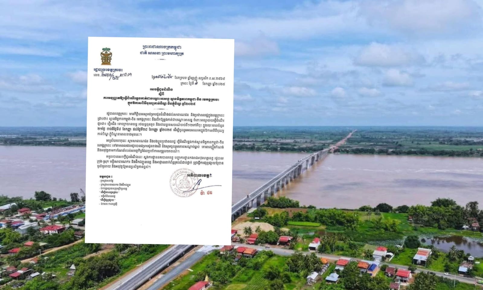 រដ្ឋបាលខេត្តក្រចេះ សូមជម្រាបជូនដំណឹងដល់សាធារណជន និងប្រជាពលរដ្ឋក្នុងខេត្តក្រចេះ ជ្រាបថា៖ ស្ពានមិត្តភាពកម្ពុជា-ចិន មេគង្គក្រចេះ នឹងបើកឱ្យឆ្លងកាត់ជាបណ្តោះអាសន្ន ចំពោះមធ្យោបាយធ្វើដំណើរ ដូចជា៖ ថ្មើរជើង ទោចក្រយានយន្ត រថយន្តធុនតូច និងរថយន្តទេសចរណ៍ចាប់ពី១២កៅអីចុះ ក្នុងរយៈពេលចំនួន ២១ថ្ងៃ ចាប់ពីថ្ងៃទី៨ ខែកញ្ញា ដល់ថ្ងៃទី២៨ ខែកញ្ញា ឆ្នាំ២០២៥ ដើម្បីចូលរួមអបអរសាទរក្នុងឱកាសពិធីបុណ្យ កាន់បិណ្ឌ និងភ្ជុំបិណ្ឌនាពេលខាងមុខនេះ៕