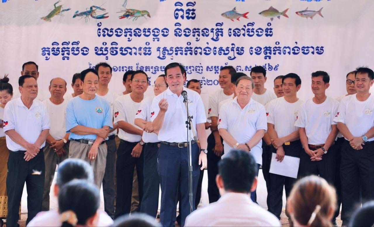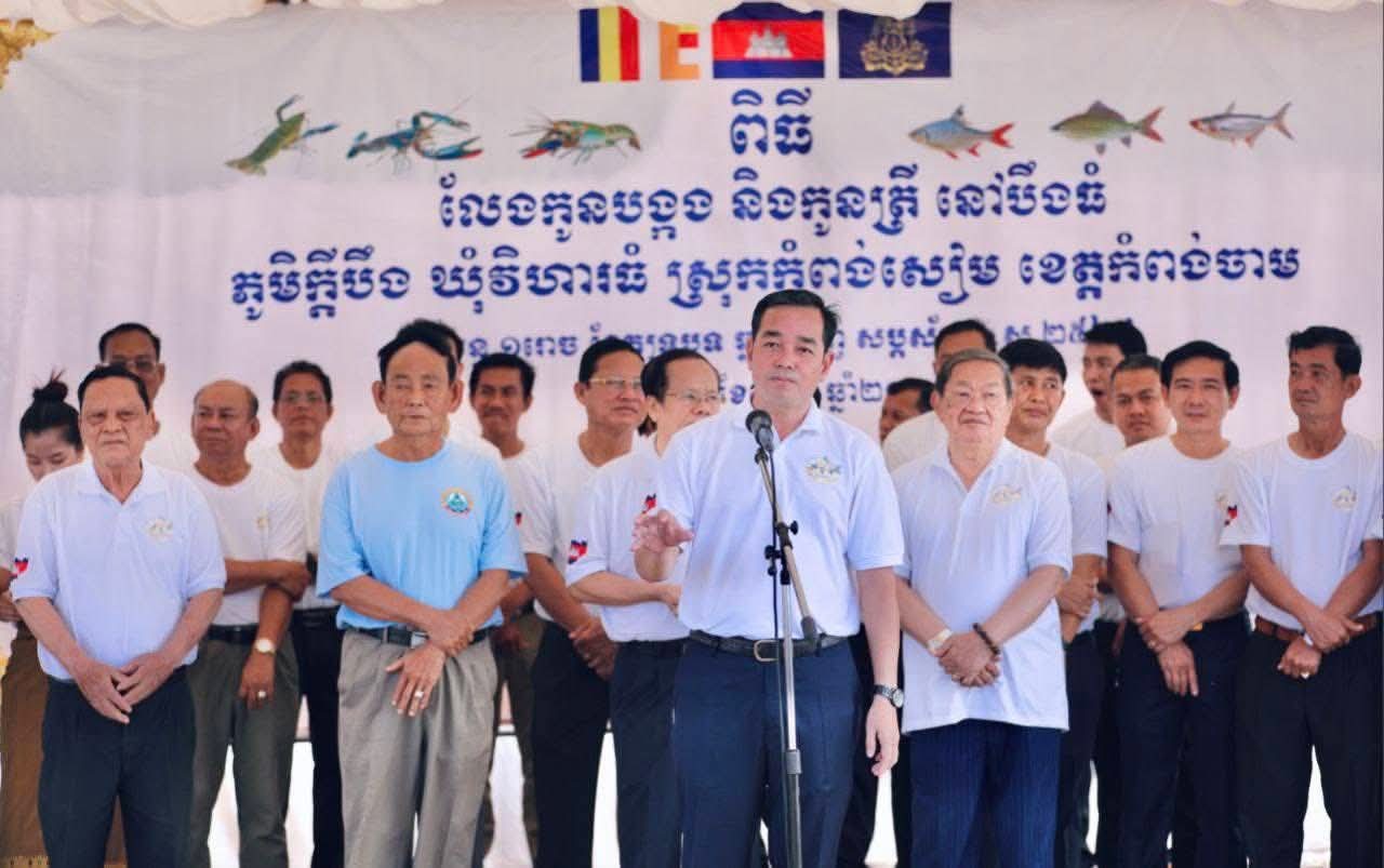 ថ្លែងក្នុងឱកាសនោះ អភិបាលខេត្តកំពង់ចាម បានបញ្ជាក់ថា កូនត្រី និងកូន បង្កង ប្រមាណជិត១០ម៉ឺនកូន ដែលយើងរួមគ្នាប្រលែងនាពេលនេះ គឺមានអត្ថន័យ និង សារៈសំខាន់បំផុត សម្រាប់បំផុសស្មារតី ប្រជាពលរដ្ឋ អាជ្ញាធរពាក់ព័ន្ធ និងវិស័យឯកជន ឱ្យចូលរួម យ៉ាងសកម្ម ក្នុងសកម្មភាព ថែរក្សា ការពារ អភិរក្ស និងបង្កើនផល ស្តុកធនធានជលផល ក្នុងបឹងធម្មជាតិ ឱ្យកាន់តែសំបូរឡើងថែមទៀត សម្រាប់ប្រជាពលរដ្ឋយើងប្រើប្រាស់កាត់បន្ថយភាព ក្រីក្រ និងបង្កើនជីវភាពរស់នៅផងដែរ។