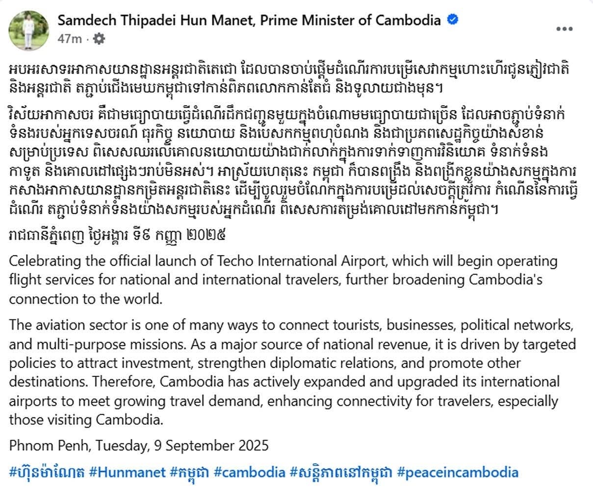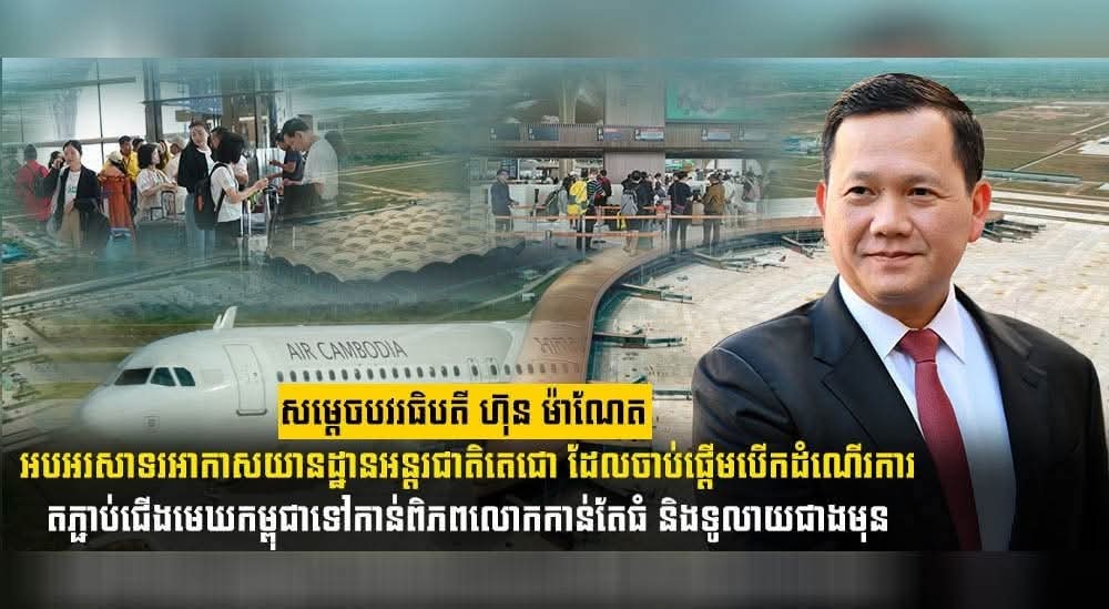(ភ្នំពេញ)៖ សម្តេចបវរធិបតី ហ៊ុន ម៉ាណែត នាយករដ្ឋមន្ត្រីនៃកម្ពុជា នៅព្រឹកថ្ងៃទី៩ ខែកញ្ញា ឆ្នាំ២០២៥នេះ បានបង្ហោះសារអបអរសាទរអាកាសយានដ្ឋានអន្តរជាតិភ្នំពេញតេជោ ដែលបានចាប់ផ្តើមដំណើរការបម្រើសេវាកម្មហោះហើរជូនភ្ញៀវជាតិ និងអន្តរជាតិ តភ្ជាប់ជើងមេឃកម្ពុជាទៅកាន់ពិភពលោកកាន់តែធំ និងទូលាយជាងមុន។