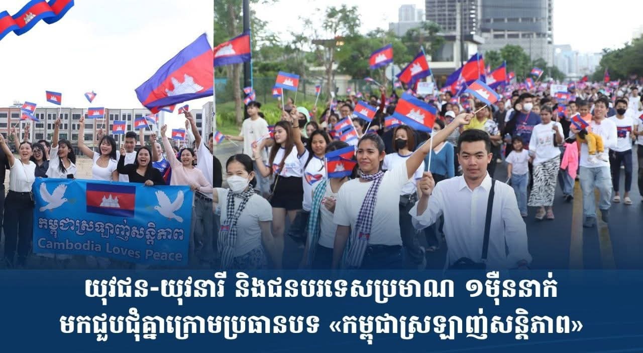 (ភ្នំពេញ) :ក្រុមយុវជន យុវនារី រួមទាំងជនបរទេសប្រមាណ១ម៉ឺននាក់ មកជួបជុំគ្នាដើម្បីសម្តែងពីទឹកចិត្តគាំទ្រវីរៈកងទ័ពជួរមុខ និងគាំទ្រសន្តិភាព អមដោយទង់ជាតិក្រហមឆ្អិនឆ្អៅក្រោមប្រធានបទ «កម្ពុជាស្រឡាញ់សន្តិភាព» នារសៀលថ្ងៃទី២ ខែសីហា ឆ្នាំ២០២៥ នៅបរិវេណបឹងកក់ ខណ្ឌដូនពេញ រាជធានីភ្នំពេញ។