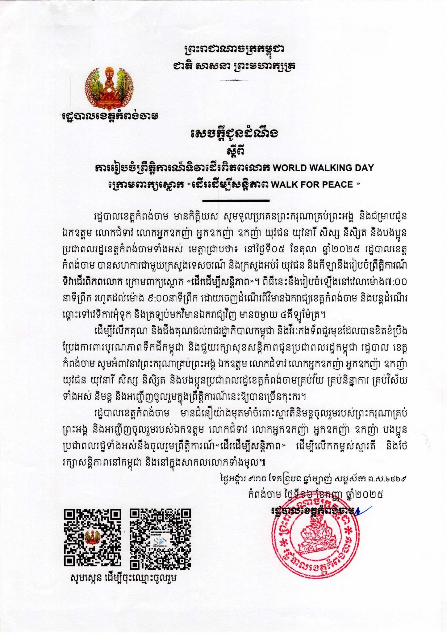 (កំពង់ចាម) : សេចក្ដីជូនដំណឹង របស់រដ្ឋបាលខេត្តកំពង់ចាម ស្ដីពីការរៀបចំព្រឹត្តិការណ៍ដើរពិភពលោក WORLD WALKING DAY ក្រោមពាក្យស្លោក «ដើរដើម្បីសន្តិភាព WALK FOR PEACE»