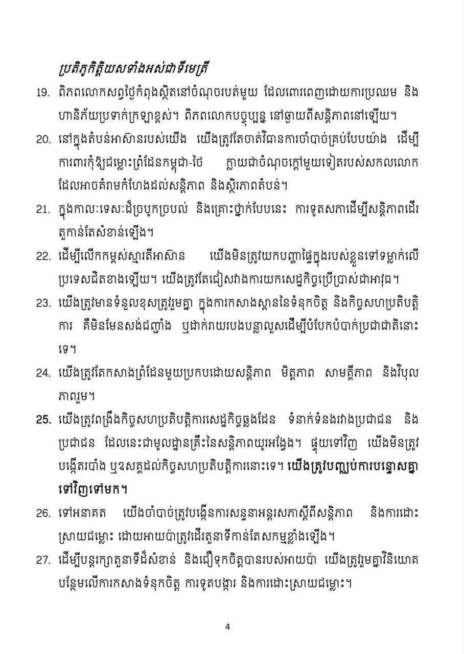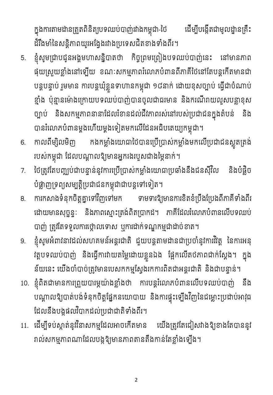 ជាមួយគ្នានេះ សម្តេចក៏បានអំពាវនាវ បញ្ឈប់ការប្រើប្រាស់កម្លាំងយោធា ដើម្បីបោះបង្គោលព្រំដែនជាឯកតោភាគី ហើយទុកភារកិច្ចស្របច្បាប់ឱ្យគណៈកម្មការព្រំដែនចម្រុះ(JBC) បន្តការងាររបស់ខ្លួន តាមមធ្យោបាយសន្តិវិធី ផ្អែកលើកិច្ចព្រមព្រៀងដែលមានស្រាប់ និងច្បាប់អន្តរជាតិ។ សម្តេចបានបញ្ជាក់ថា តុលាការយុត្តិធម៌អន្តរជាតិ (ICJ) ធ្លាប់បានសម្រេចសេចក្តីលើករណីប្រាសាទព្រះវិហារ ក្នុងឆ្នាំ១៩៦២ និងតំបន់ជុំវិញប្រាសាទក្នុងឆ្នាំ២០១៣ ដែលជាមូលដ្ឋានគតិយុត្តដ៏សំខាន់សម្រាប់ភាគីទាំងពីរ ក្នុងការដោះស្រាយជម្លោះព្រំដែន ដោយសន្តិវិធី ជាពិសេសពាក់ព័ន្ធនឹងតំបន់ដែលមិនទាន់មានការឯកភាពគ្នា៕
