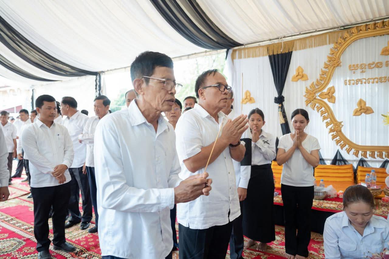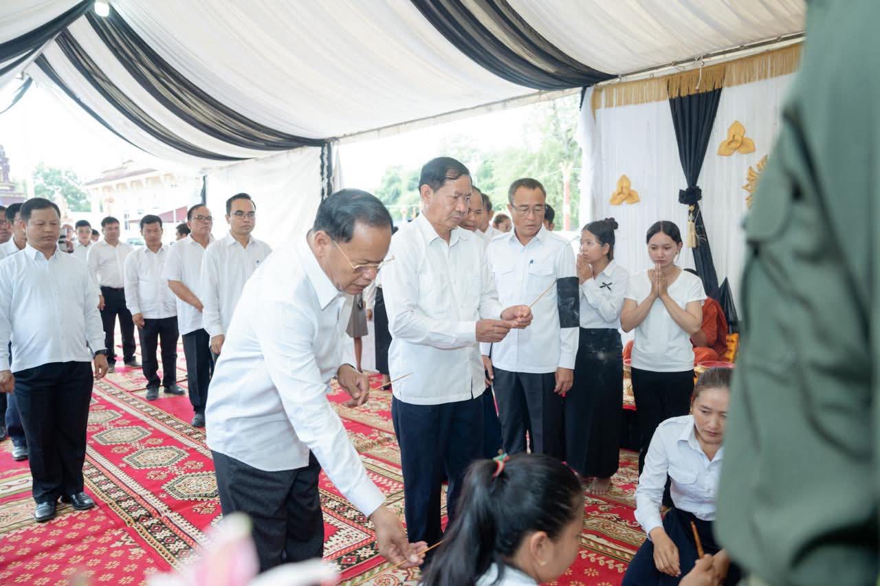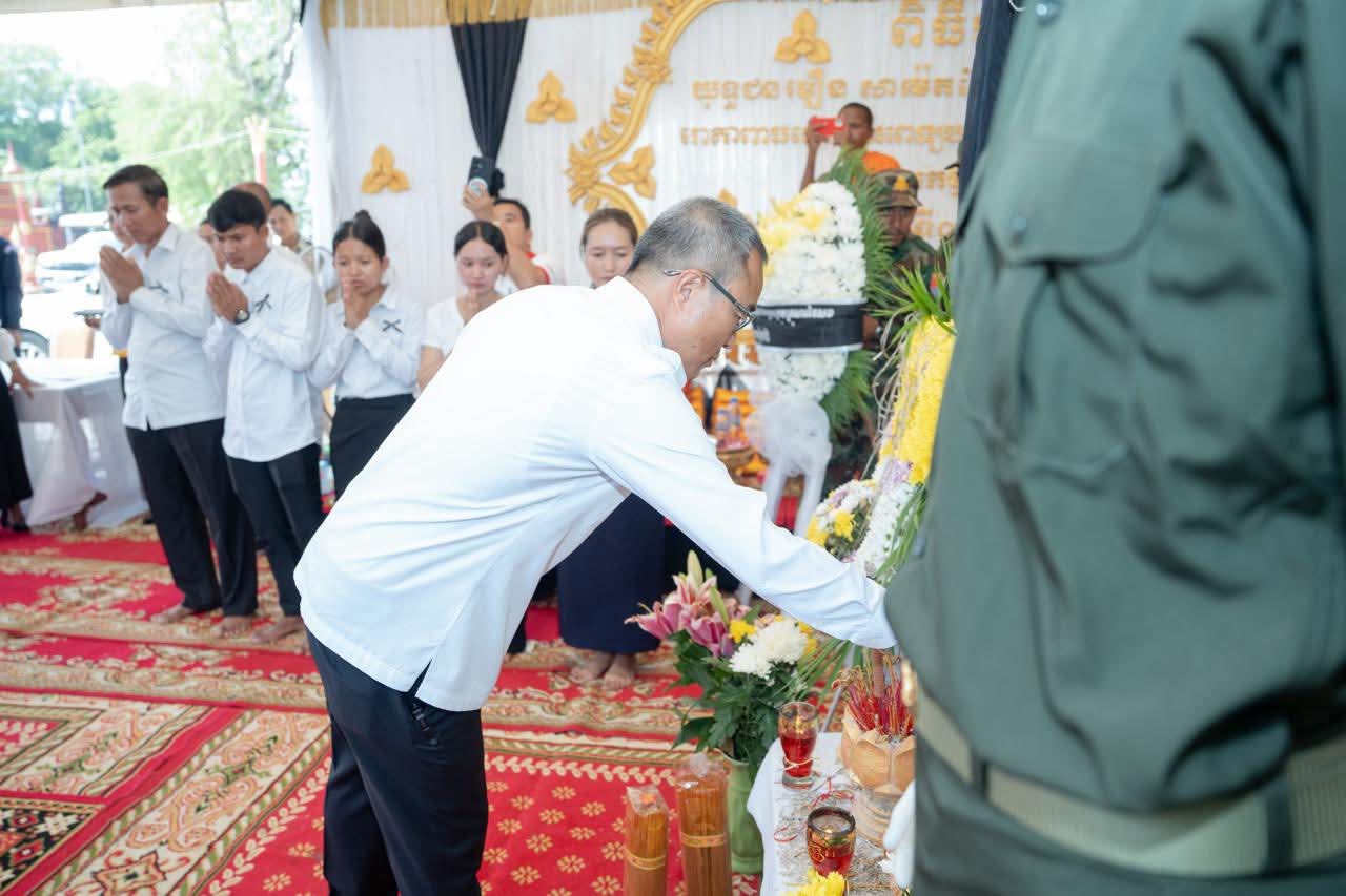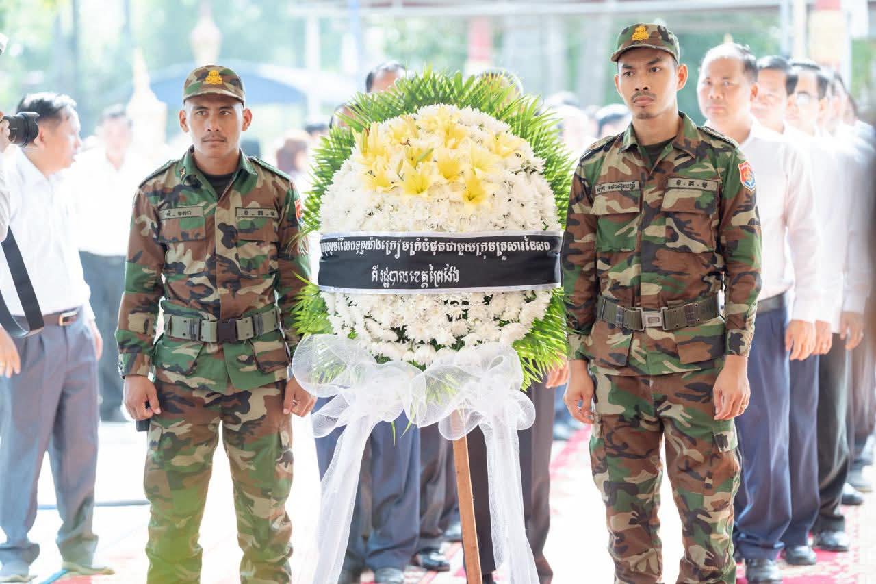 (ព្រៃវែង) : នៅព្រឹកថ្ងៃអាទិត្យ ៩កើត ខែស្រាពណ៍ ឆ្នាំម្សាញ់ សប្តស័ក ព.ស.២៥៦៩ ត្រូវនឹងថ្ងៃទី០៣ ខែសីហា ឆ្នាំ២០២៥នេះ ឯកឧត្តម សួន សុម៉ាលីន អភិបាល នៃគណៈអភិបាលខេត្តព្រៃវែង រួមជាមួយថ្នាក់ដឹកនាំខេត្ត បានអញ្ជើញចូលរួមគោរពវិញ្ញាណក្ខន្ធសព អនុសេនីយ៍ត្រី មឿន សាម៉េត ជាយោធិននៃកងពលធំអន្តរាគមន៍លេខ២ កងទ័ពជើងគោក ដែលបានទទួលមរណៈភាព កាលពីថ្ងៃទី០១ ខែសីហា ឆ្នាំ២០២៥ ដោយរោគាពាធ ក្នុងពេលបំពេញបេសកកម្មការពារបូរណភាពទឹកដី នៅតាមបណ្ដោយព្រំដែន ដែលពិធីបុណ្យប្រារព្ធធ្វើនៅវត្តកស្សបៈ ភូមិដងទង់ ឃុំប្រាសាទ ស្រុកកំពង់ត្របែក ខេត្តព្រៃវែង។