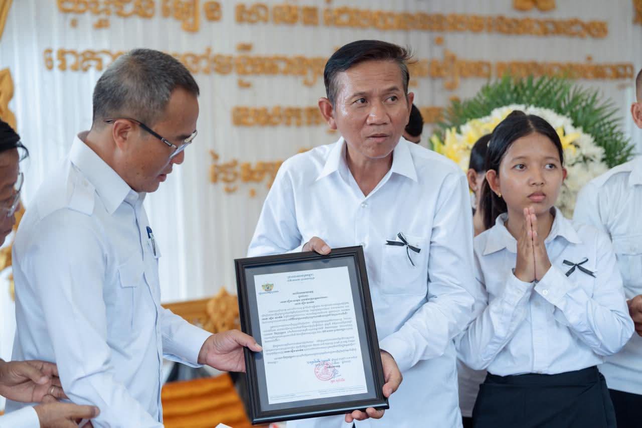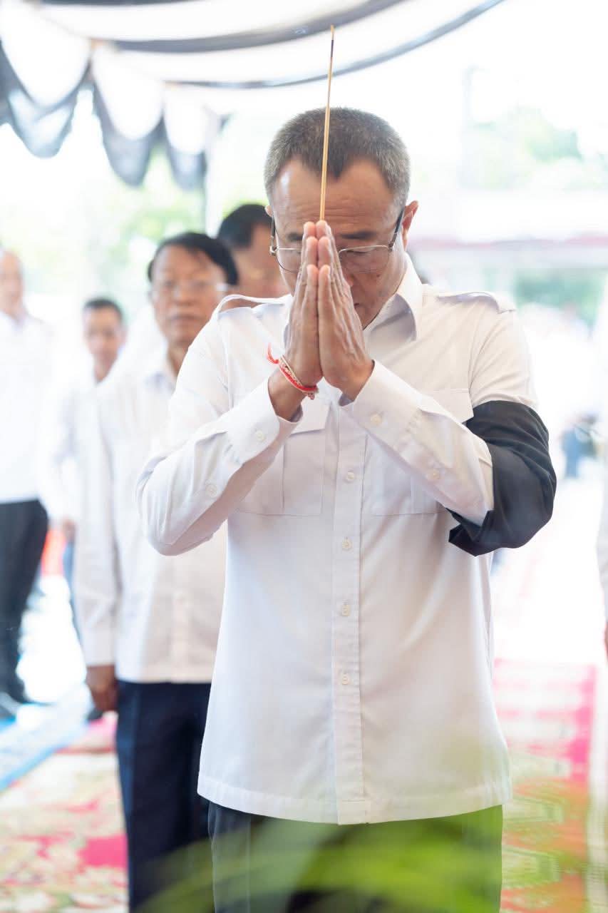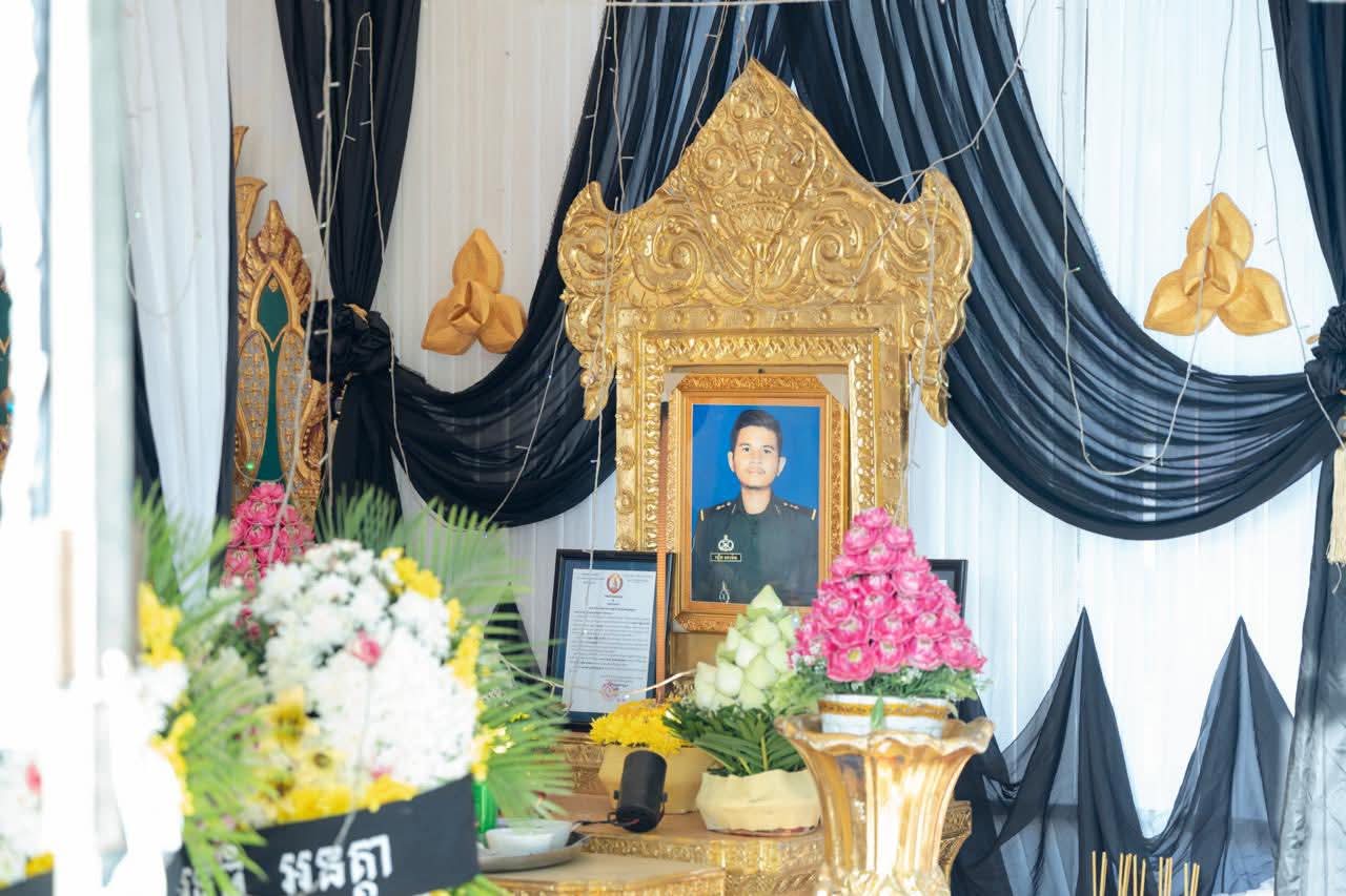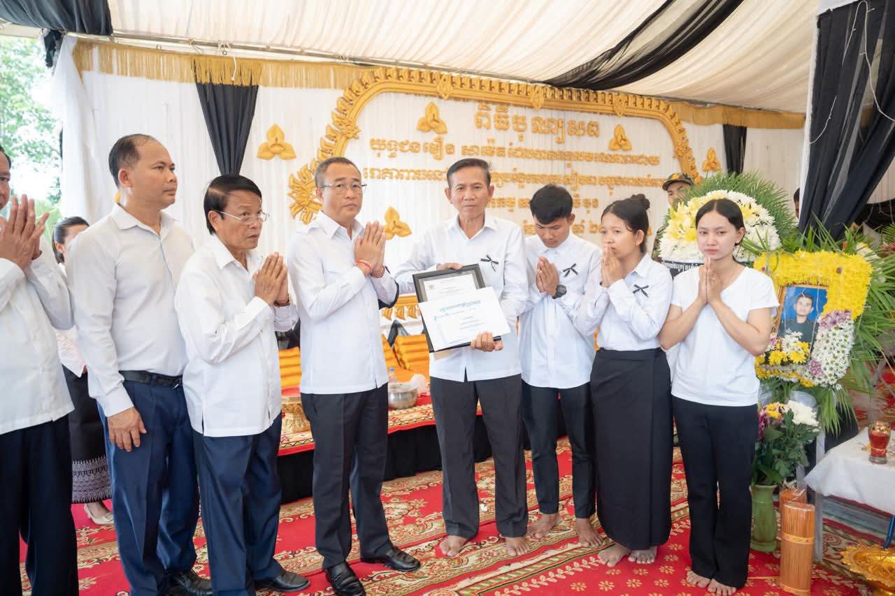 (ព្រៃវែង) : នៅព្រឹកថ្ងៃអាទិត្យ ៩កើត ខែស្រាពណ៍ ឆ្នាំម្សាញ់ សប្តស័ក ព.ស.២៥៦៩ ត្រូវនឹងថ្ងៃទី០៣ ខែសីហា ឆ្នាំ២០២៥នេះ ឯកឧត្តម សួន សុម៉ាលីន អភិបាល នៃគណៈអភិបាលខេត្តព្រៃវែង រួមជាមួយថ្នាក់ដឹកនាំខេត្ត បានអញ្ជើញចូលរួមគោរពវិញ្ញាណក្ខន្ធសព អនុសេនីយ៍ត្រី មឿន សាម៉េត ជាយោធិននៃកងពលធំអន្តរាគមន៍លេខ២ កងទ័ពជើងគោក ដែលបានទទួលមរណៈភាព កាលពីថ្ងៃទី០១ ខែសីហា ឆ្នាំ២០២៥ ដោយរោគាពាធ ក្នុងពេលបំពេញបេសកកម្មការពារបូរណភាពទឹកដី នៅតាមបណ្ដោយព្រំដែន ដែលពិធីបុណ្យប្រារព្ធធ្វើនៅវត្តកស្សបៈ ភូមិដងទង់ ឃុំប្រាសាទ ស្រុកកំពង់ត្របែក ខេត្តព្រៃវែង។