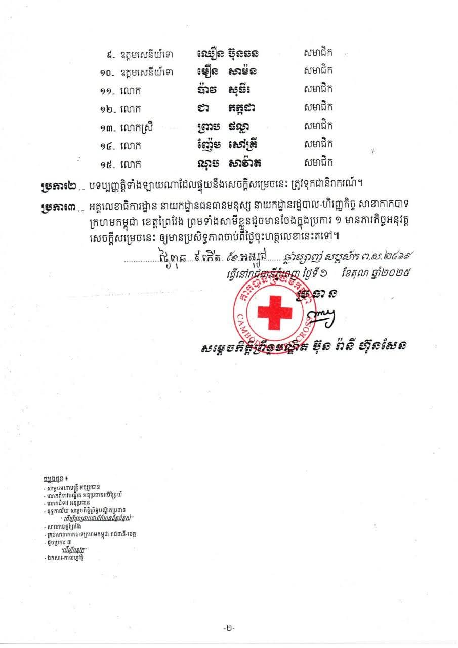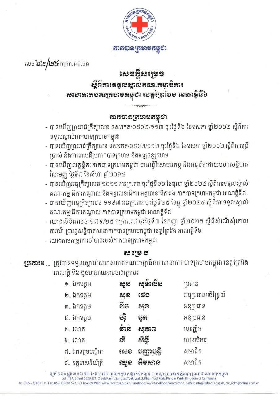 សូមគោរពជូនពរ ឯកឧត្តម សួន សុម៉ាលីន ប្រធាន និងសមាជិក សមាជិកា គណៈកម្មាធិការសាខាអាណត្តិទី៦ សូមសមប្រកបដោយពុទ្ធពរទាំងបួនប្រការ គឺ អាយុ វណ្ណៈ សុខៈ ពលៈ ជានិច្ចនិរន្តរ៍តរៀងទៅ៕