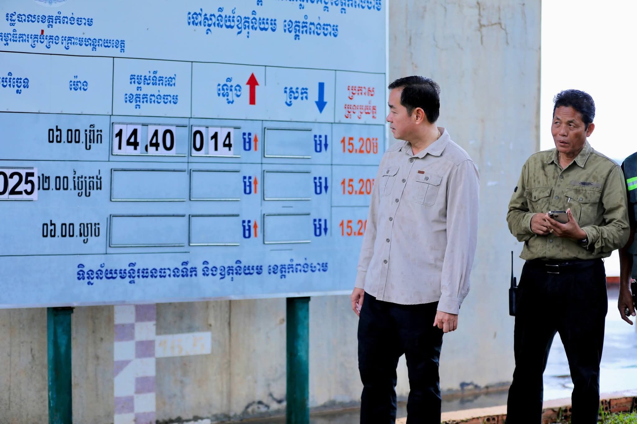 ជាវិធានការ ក្នុងបង្ការទប់ស្កាត់ ពីផលប៉ះពាល់ដោយសារទឹកជំនន់ មកលើភូមិឋាន ស្រែចំការរបស់បងប្អូនប្រជាពលរដ្ឋ ស្ថិតនៅតាមបណ្ដោយមាត់ទន្លេមេគង្គ ខេត្តកំពង់ចាម នៅព្រឹកថ្ងៃទី២ ខែតុលា ឆ្នាំ២០២៥ នេះ ឯកឧត្តម អ៊ុន ចាន់ដា អភិបាលនៃគណៈអភិបាលខេត្តកំពង់ចាម បានដឹកនាំក្រុមការងារខេត្ត មន្ទីរអង្គភាពជំនាញ និងមន្ត្រីពាក់ព័ន្ធ អញ្ជើញ ចុះពិនិត្យស្ថានភាពទឹកជំនន់ទន្លេមេគង្គ និងជំនន់ទឹកភ្លៀង ស្ថិតនៅតាមបណ្តោយមាត់ទន្លេ ក្នុងក្រុងកំពង់ចាម ដើម្បីសិក្សាលិទ្ធភាព ក្នុងកាតអន្តរាគមន៍ បង្ការ ទប់ស្កាត់ កុំឲ្យមានហានិភ័យកើតឡើងជាយថាហេតុ។