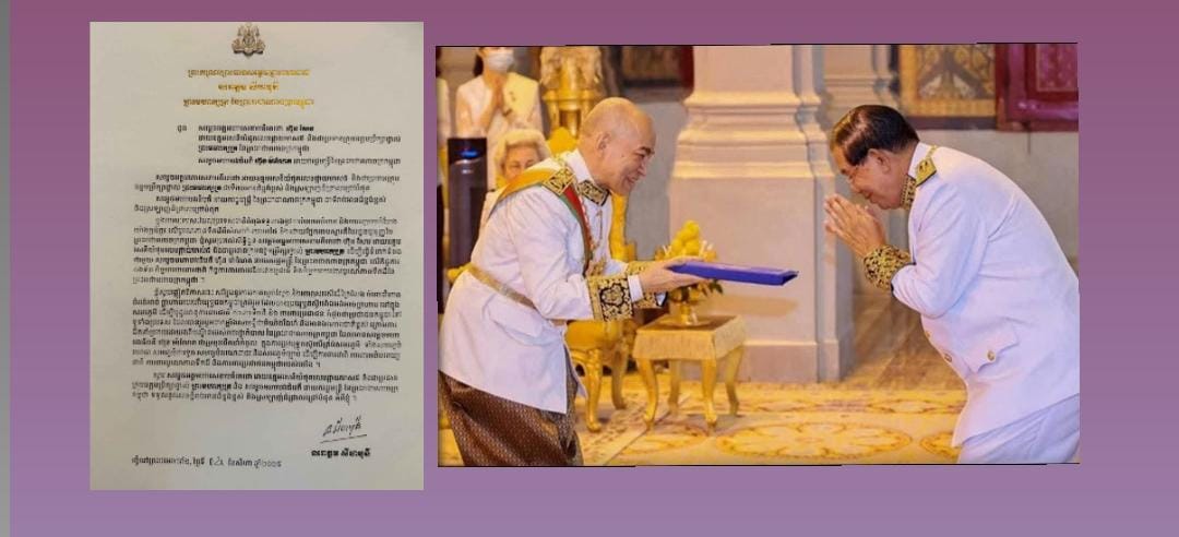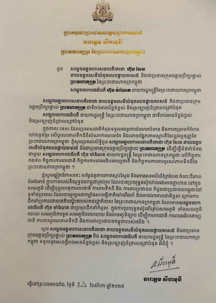 ក្នុងកាលៈទេសៈដែលប្រទេសជាតិកំពុងទទួលរងនូវការរំលោភបំពាន និងការគម្រាមកំហែងយ៉ាងធ្ងន់ធ្ងរ លើបូរណភាពទឹកដីពីសំណាក់យោធាថៃ និងដោយផ្អែកតាមស្មារតីនៃរដ្ឋធម្មនុញ្ញន ព្រះរាជាណាចក្រកម្ពុជា ខ្ញុំសូមប្រគល់សិទ្ធិជូន សម្តេចអគ្គមហាសេនាបតីតេជោ ហ៊ុន សែន នាយឧត្តមសេនីយ៍ផុតលេខផ្កាយមាស់៥ និងជាប្រធានក្រុមឧត្តមប្រឹក្សាផ្ទាល់ ព្រះមហាក្សត្រ ដើម្បីធ្វើទំនាក់ទំនងជាមួយ សម្តេចមហាបវរធិបតី ហ៊ុន ម៉ាណែត នាយករដ្ឋមន្ត្រី នៃព្រះរាជាណាចក្រកម្ពុជា លើកិច្ចការកងទ័ព កិច្ចការការពារជាតិ កិច្ចការការពារអធិបតេយ្យជាតិ និងកិច្ចការការពារបូរណភាពទឹកដីនៃព្រះរាជាណាចក្រកម្ពុជា ។