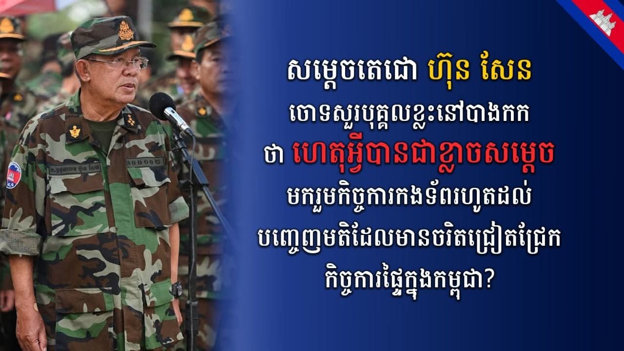 ព្រឹកមិញកាសែតថៃបានចុះផ្សាយអំពីមនុស្សខ្លះនៅបាងកកបាននិយាយថាខ្ញុំធ្វើខុសរដ្ឋធម្មនុញ្ញរបស់កម្ពុជាព្រោះឃើញខ្ញុំចូលរួមបញ្ជាកងទ័ព។ មិនបាច់ឆ្ងល់ទេ កុំថាឡើយខ្ញុំជាថ្នាក់ដឹកនាំប្រទេស សូម្បីតែខ្ញុំជាពលរដ្ឋម្នាក់ ក៏ខ្ញុំមានសិទ្ធិវាយពួកចោរឈ្លានពានប្រទេសរបស់ខ្ញុំដែរ។
